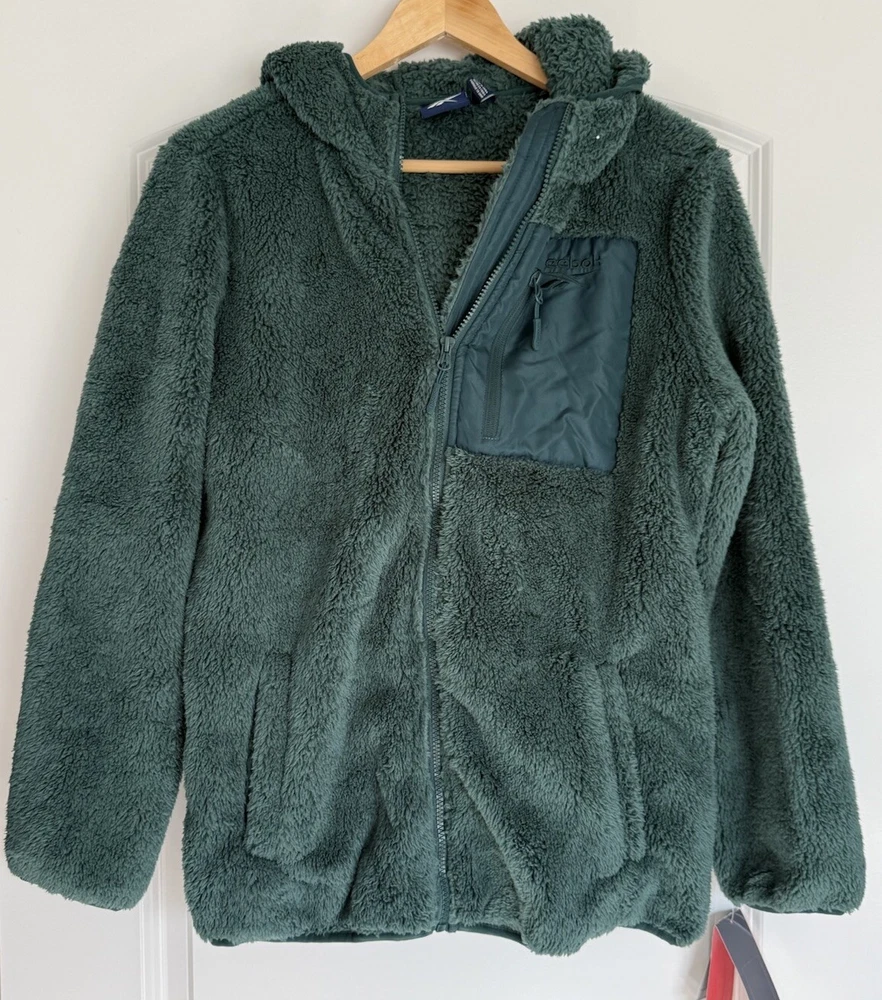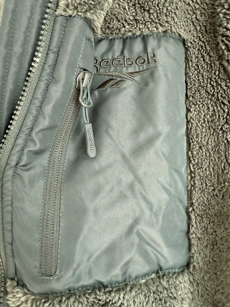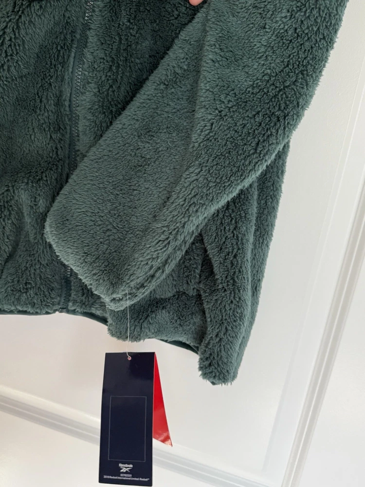 Stay warm and stylish this winter with this NWT Women's Green Reebok Faux Fur Hooded Jacket in size L. The jacket features a cozy faux fur hood, perfect for keeping you warm during cold weather. The outer shell material is made of high-quality faux fur, ensuring a soft and comfortable feel. The jacket comes in a basic style that is perfect for any occasion, with a green color that adds a pop of color to your wardrobe. The features of this jacket include a hooded design and a regular size type, making it perfect for women of all sizes.