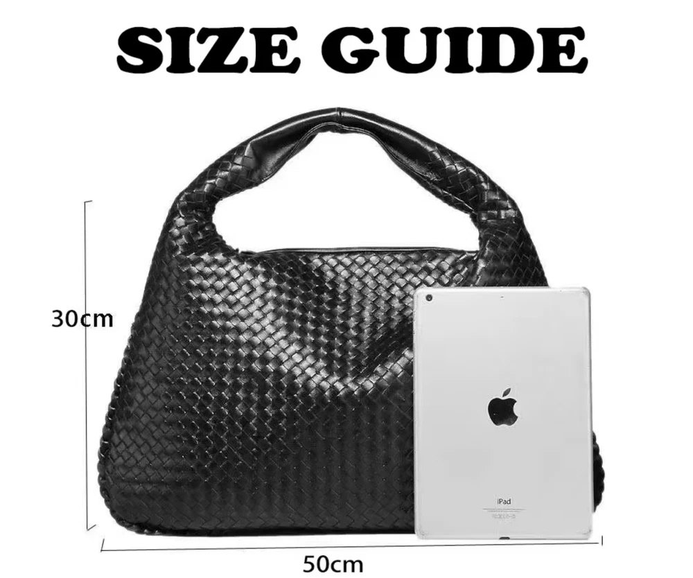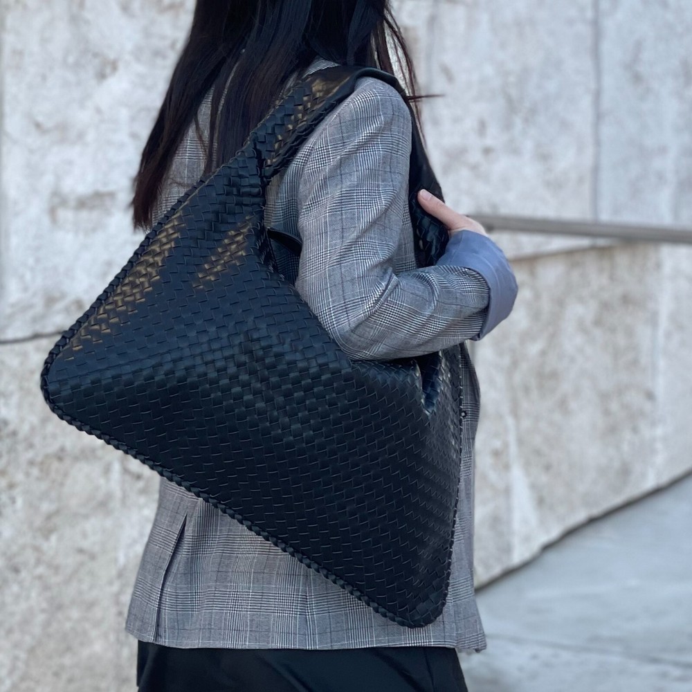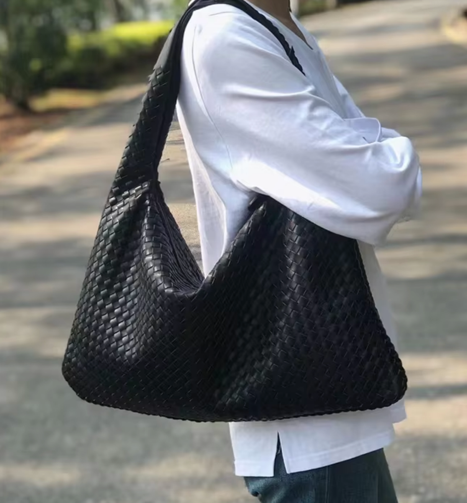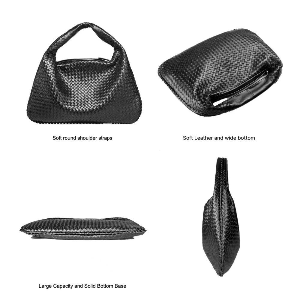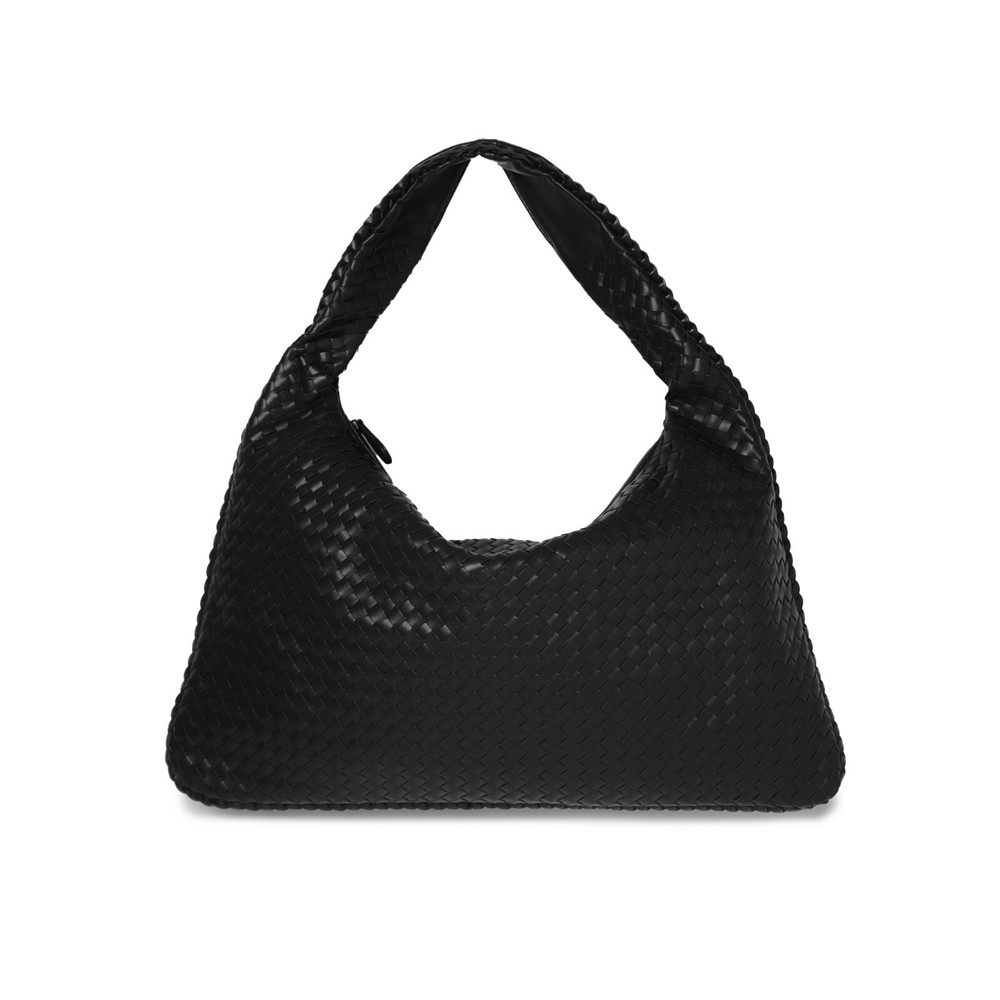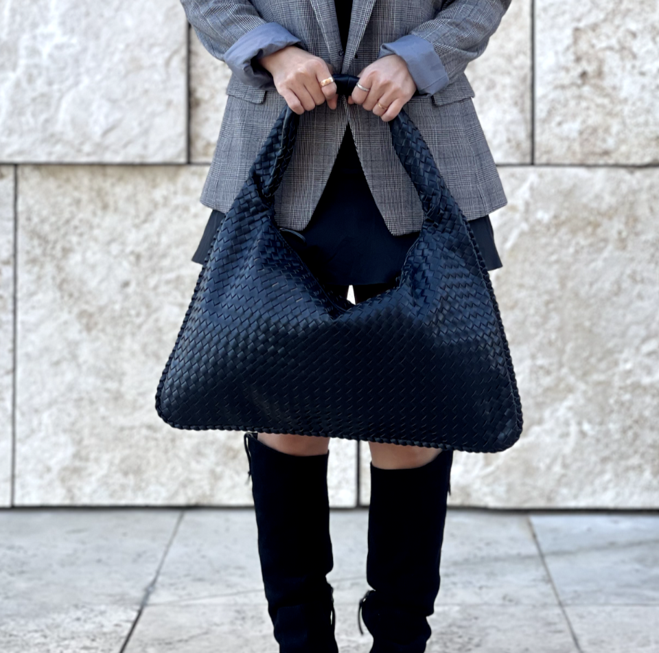 Crafted with an eye for style and an ear for sustainability, this Happy California woven hobo bag is a medium-sized essential for any wardrobe. The sleek black vegan leather exterior is complemented by a chic crescent shape and a braided detail perimeter, all accented with elegant gold hardware. The bag measures 21" in width, 12.5" in height, and 8" in depth, offering ample space for daily essentials. The hobo bag features a zip closure and a versatile 12" strap drop, allowing for comfortable shoulder wear. Inside, the bag is thoughtfully lined in a woven fabric and includes two slip pockets and one zip pocket to keep belongings organized. Whether you're running errands or heading out for the evening, this bag's blend of functionality and fashionable flair makes it a go-to accessory.