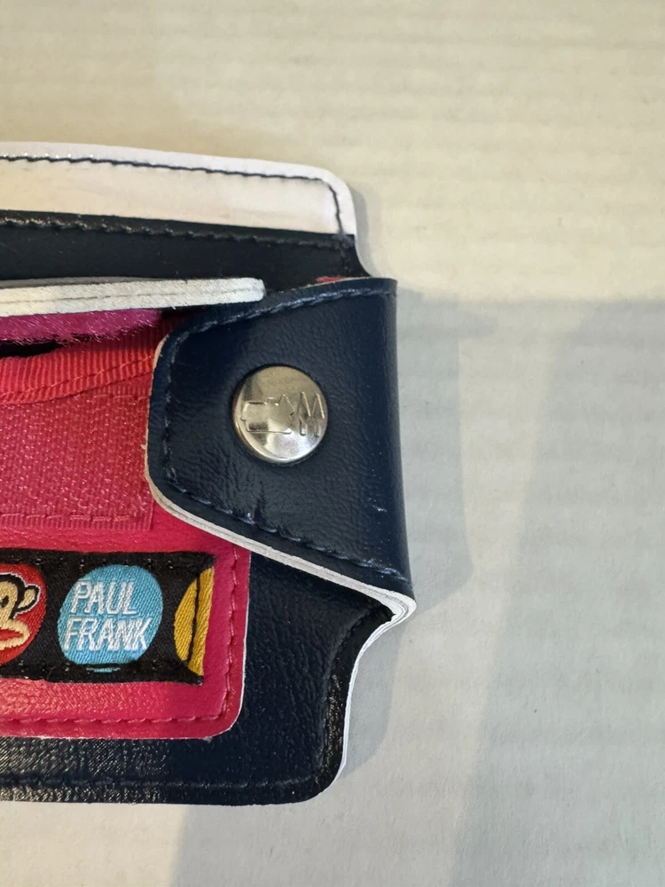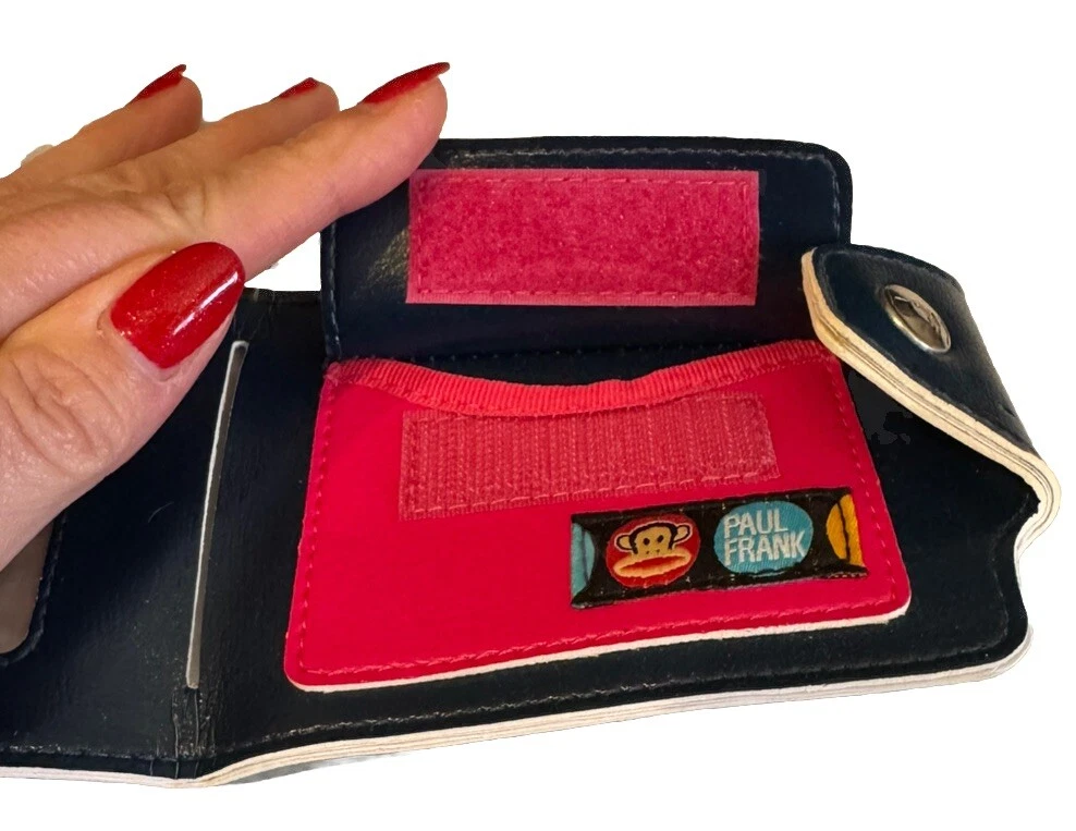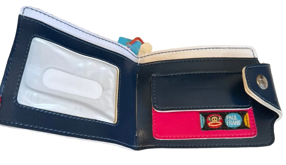 Character:Julius The MonkeyBrand:Paul FrankColor:Navy blueMaterial:VinylType:WalletFabric Type:VinylDepartment:UnisexAccents:Zipper, Snap, Bill Slot, Credit Card Slots X 5Features:Credit Card, Folding, Zip Change Pocket
