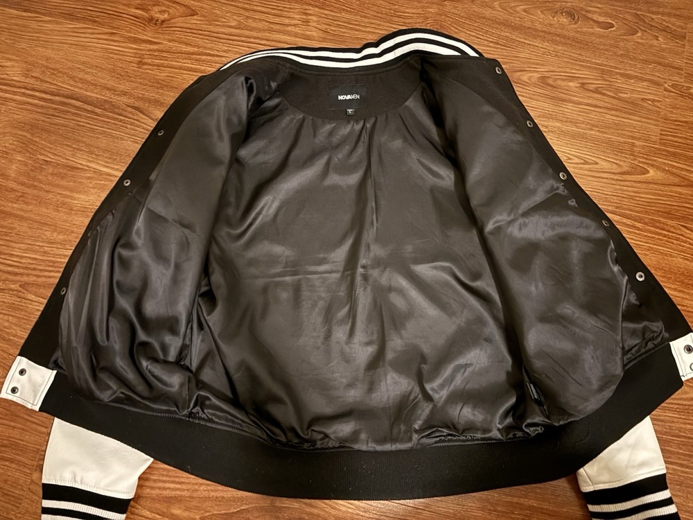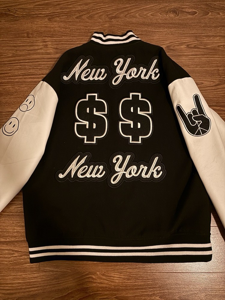 Embrace the timeless appeal of a NY varsity jacket from Fashion Nova, tailored to fit a regular size L. This classic black jacket is a versatile addition to any wardrobe, effortlessly blending retro sports themes with modern style. The durable polyester outer shell and lining ensure comfort and protection, while the lightweight design keeps you versatile for all-season wear. With features that include a sleek silhouette and comfortable fit, this jacket is designed for the style-conscious individual. Whether you're out for a casual meet-up or looking to add a retro touch to your everyday attire, this varsity jacket fits the bill for a chic, laid-back look. -Worn only a few times, in great condition. -size is L or Top (US) 42 or Chest (in) 42-44