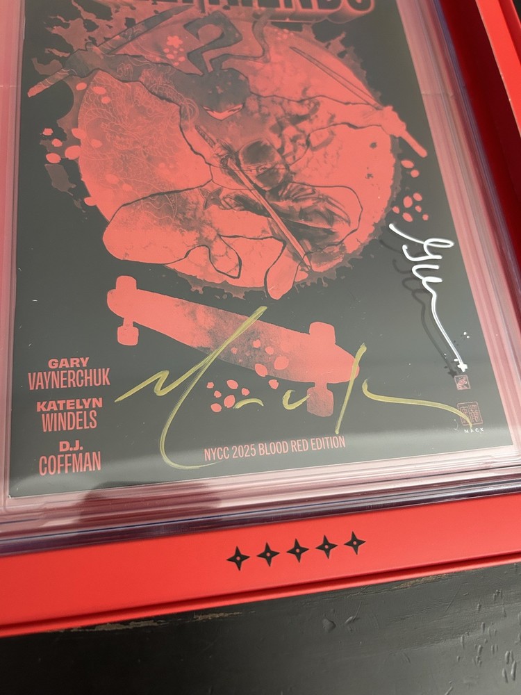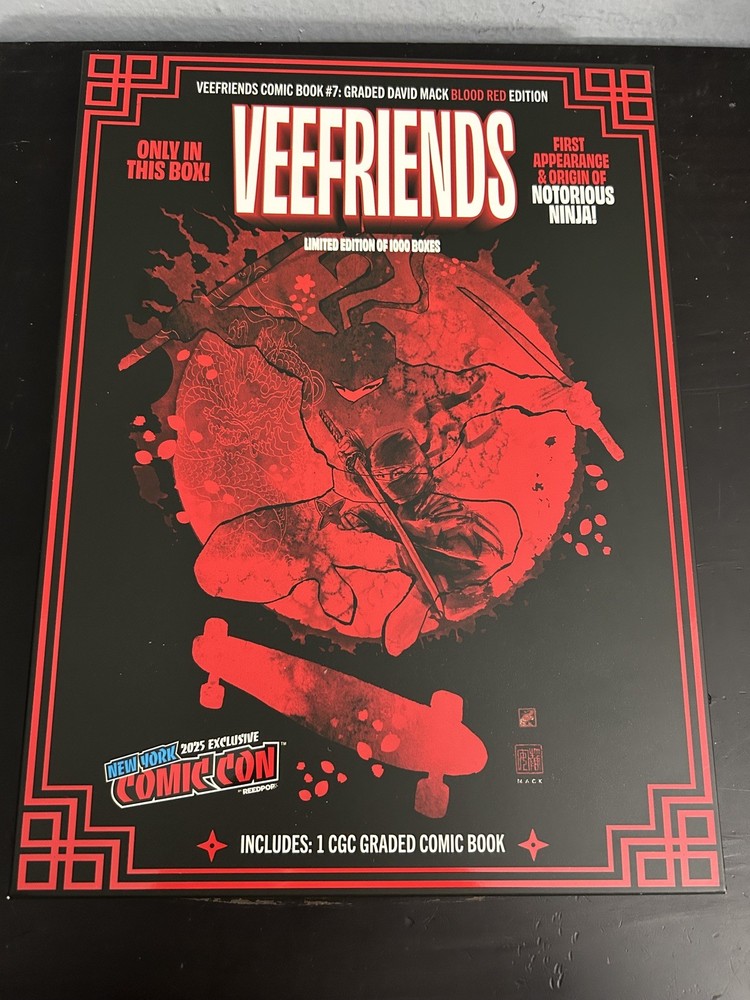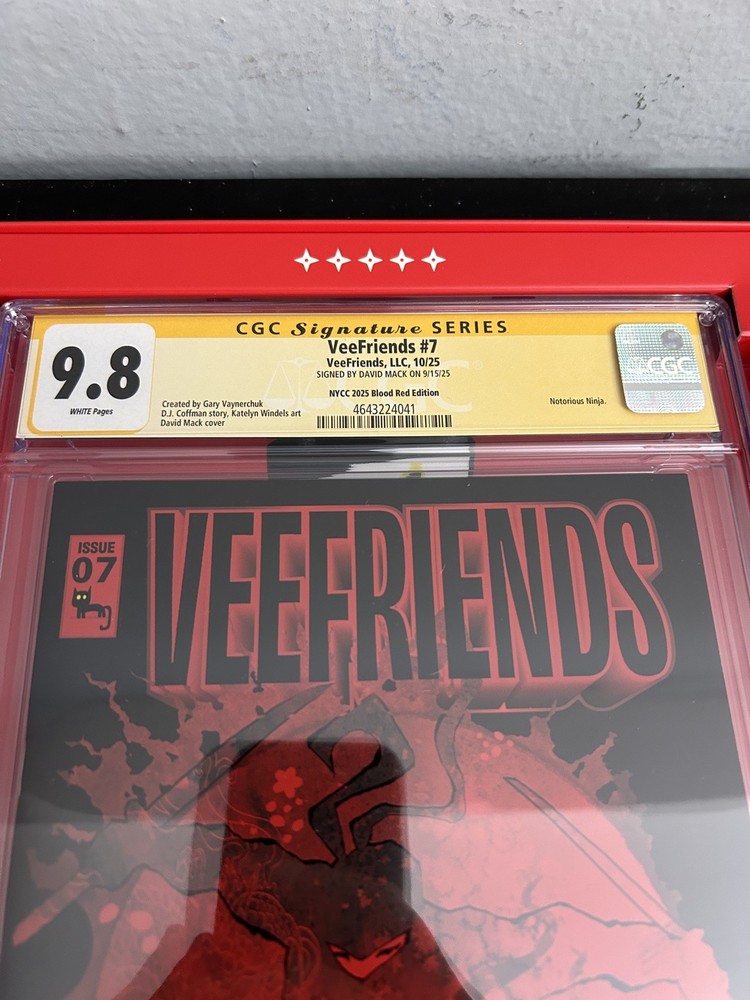 The product is a limited edition comic book from the series "VeeFriends" titled "Notorious Ninja". Signed by David Mack, this comic is a single issue from the modern age era of US comics. Published in 2025, this double-auto CGC 9.8 comic features a unique blood red color scheme and is a must-have for comic collectors and fans of the VeeFriends series. With only 50 units available, this rare and highly sought-after comic is a valuable addition to any collection.