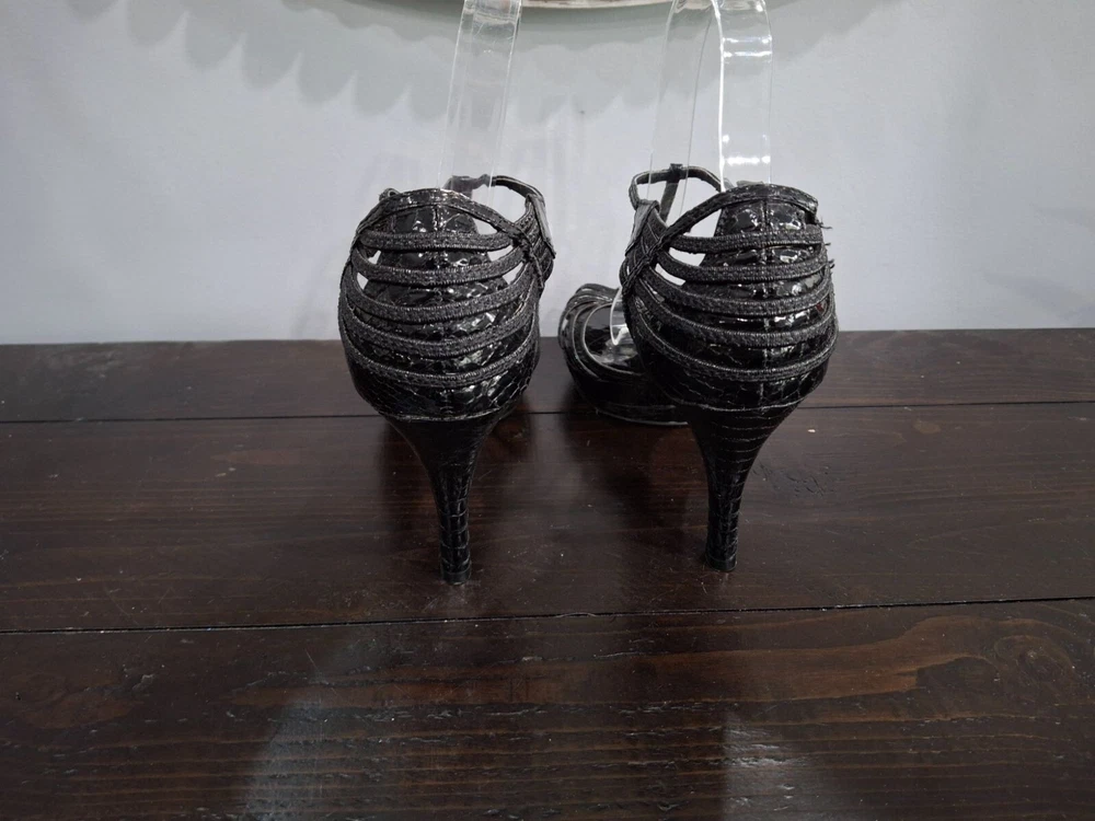 Pre-owned in excellent used condition. The only blemish is where a sticker was removed from the right inner sole (see Pictures). Add pizazz with these New York Transit metallic black strappy heels. These feature side buckle closure and a 3.5" heel. Features: • New York Transit • Black Metallic Faux Leather • 3.5" Heel • Excellent Used Condition • Women's size 8M • Strappy heel, Metallic Black Size: Womens 8 Condition: Pre-Owned Like New