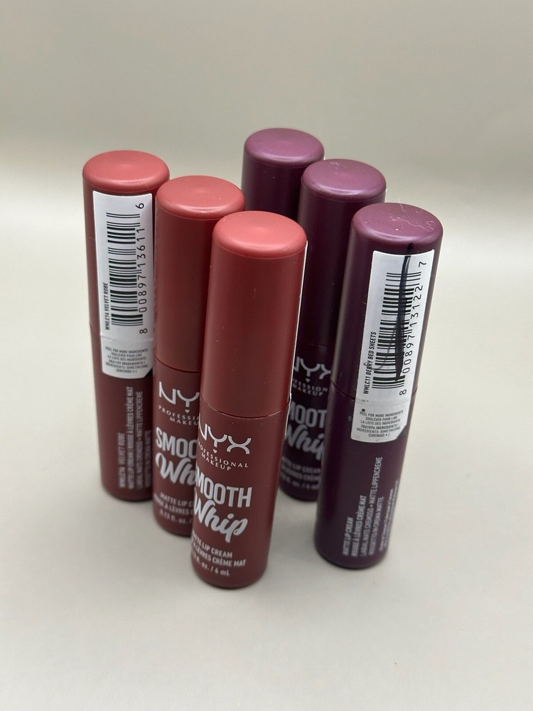 The NYX Smooth Whips Set of 6 Lip Cream in Velvet Rose & Bed Sheets is a luxurious lipstick set that offers a velvety matte finish. Each lipstick is formulated with creamy consistency for a comfortable and long-lasting wear. With assorted shades to choose from, this set is perfect for adding a touch of elegance to your lips. Made in Taiwan, these lipsticks are unflavored and perfect for everyday wear or special occasions.