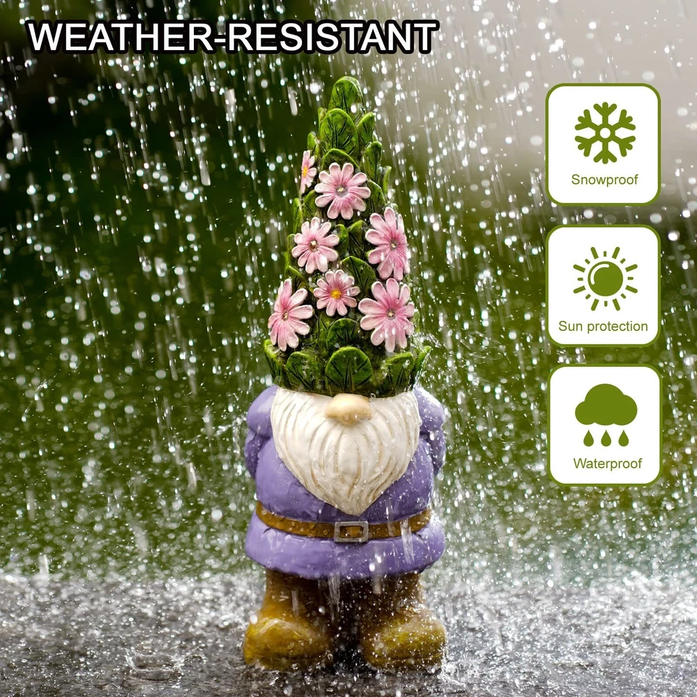 Nacome Solar Garden Outdoor Statues Gnome with Succulent and 7 LED Lights - Lawn Decor for Patio, Balcony, Yard Ornament - Unique Housewarming Gifts Product Details Color: Purple Gnome Brand: Nacome MPN: Gnome with Glowing Flowers UPC: Does not apply EAN: Does not apply Color: Purple Gnome Brand: Nacome Theme: Garden Material: Resin Style: Garden Color: Purple Gnome Brand: Nacome Theme: Garden Material: Resin Style: Garden Occasion: Christmas, Father Day, Birthday, Mother Day, Garden Gifts Product Dimensions: 4.14"D x 4.33"W x 11.42"H Recommended Uses For Product: Outdoor Mounting Type: Tabletop Cartoon Character: Solar Turtle Statue Special Feature: Waterproof, Handmade Included Components: Rechargeable Battery Product Care Instructions: Wipe Clean Collection Name: birthday collection Seasons: All Seasons Number of Items: 1 Manufacturer: Yeemore home Part Number: Gnome with Glowing Flowers Item Weight: 1.74 pounds Country of Origin: China Item model number: Solar Gnome Batteries: 1 AAA batteries required. (included) Shape: Novelty Item Package Quantity: 1 Number Of Pieces: 1 Special Features: Waterproof, Handmade Usage: Garden Batteries Included?: Yes Batteries Required?: Yes Battery Cell Type: NiMH Date First Available: December 1, 2022 Professional After-Sales Service:We take your shopping experience very seriously, If you have any questions about this product, please contact seller directly to provide you with a satisfactory after-sales guarantee. Order without worries Renewable and Clean Energy:Powered by electricity, converted from solar power during the day - stored in a rechargeable 1.2 V AAA 300 mAH Ni-MH Battery - Runs up to eight-ten hours with a full charge of sun light Easy to Use:Simply turn the statue on during the daytime. The solar panel will charge during the daytime and light up automatically at night. The LED lights will fully charge within six-eight hours and will light up for eight-ten hours A Great Garden Gift:The solar garden statue comes in his own beautifully designed box. A perfect gift for Mom;Grandma;Wife;Daughter;Sister;Aunt;girlfriend;wedding;birthday;Mothers Day;Fathers Day;Valentines Day and Christmas Beautiful Home and Garden Decoration:This statue suitable for garden decor;home decor;house decor;lawn ornaments;front porch decor;yard decorations outdoor;back decor;backyard decor