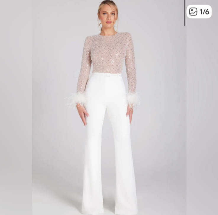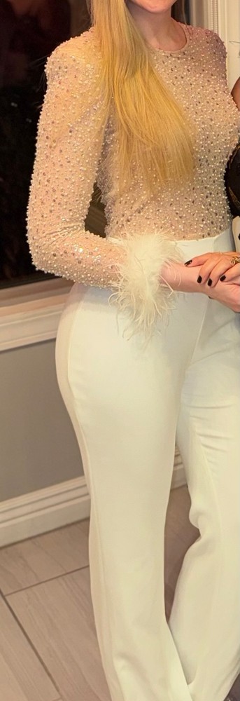 I just received this Nadine Merabi jumpsuit and am reselling. It was supposed to be for an event, but it didn’t arrive in time. This is a size S/M (size 6). It was worn twice for a few hours at a time by the previous owner. The pants are hemmed- the girl before was 5'6" and wore 3.5" heels. This is in great condition. There’s a small snag on the back of the pant, but other than that there are no defects. This feather-trim cuff jumpsuit is made from our exclusively designed embellished pearl mesh. The signature trouser is made from our crepe fabric and fully lined for a smooth fit. The contrast lining provides coverage while accentuating the embellished, intricate beading. DOES NOT COME WITH DETACHABLE BELT. I never received this and neither did the previous owner.