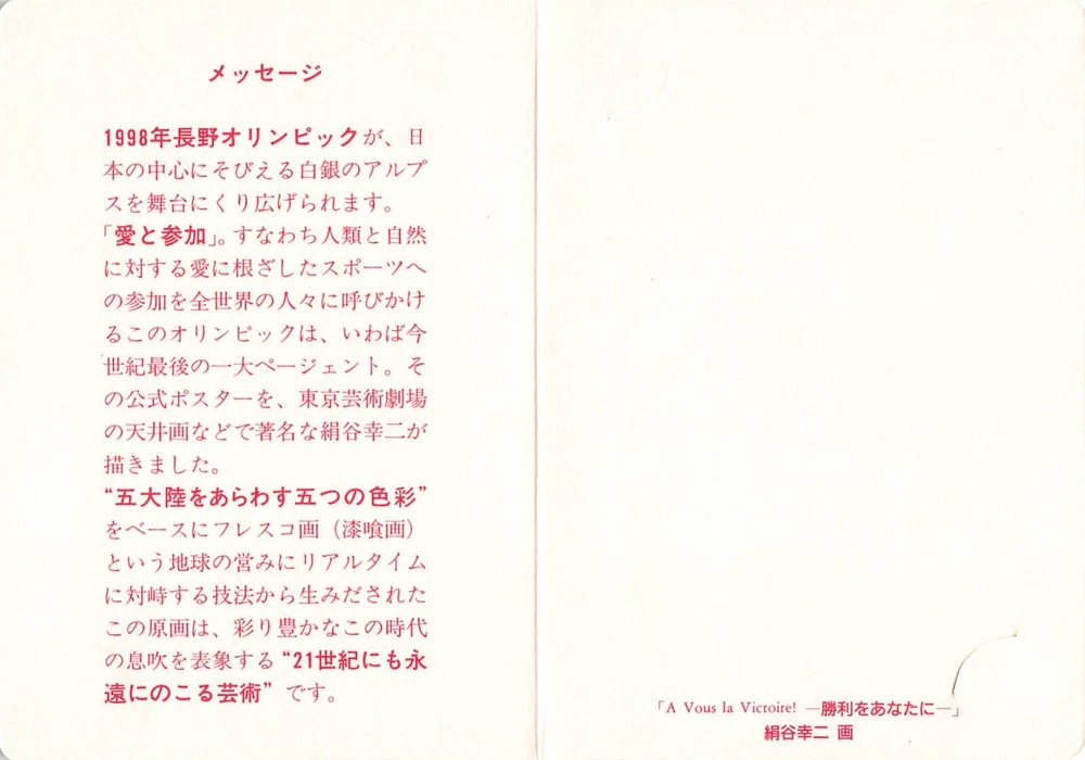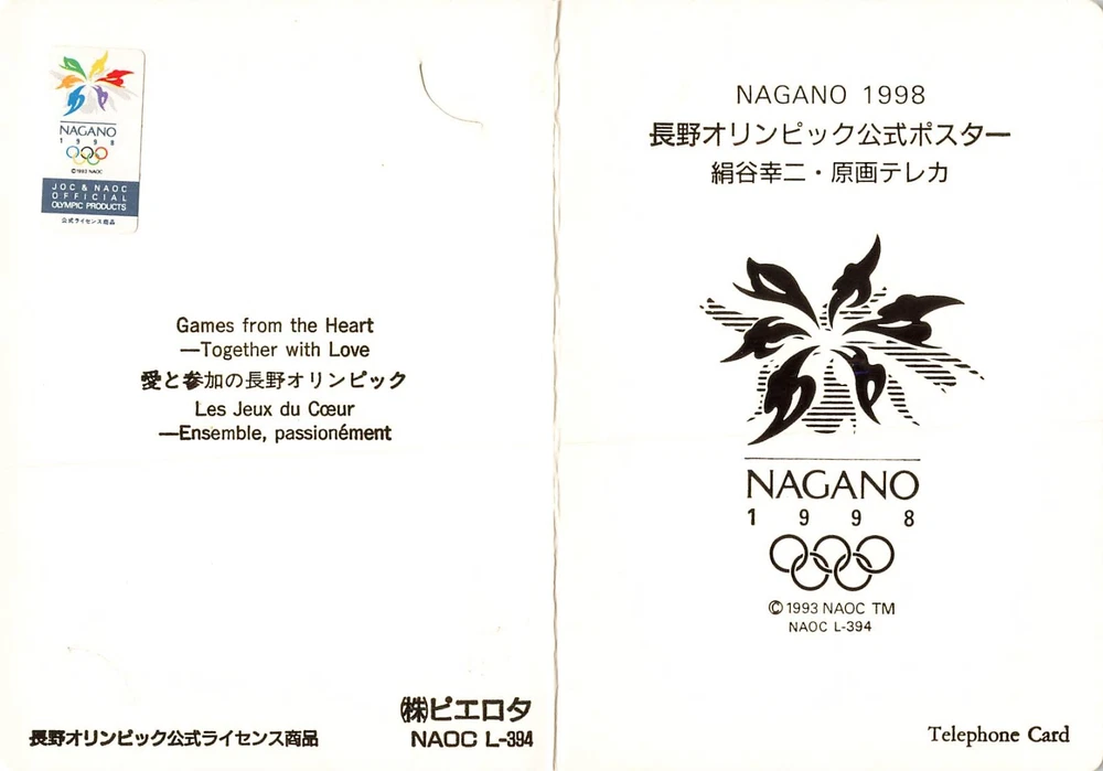 Nagano Olympic Limited Phone Card 1998 NTT Japan Official Kinutani Koji Winter on paper Sleeve You can still use it at public telephones in Japan. new/unused phone card whose balance 50 (=500 jpy) , in excellent condition with a cover. Size about 8.7 x 5.4 cm / 3 & 1/4" X 2 & 1/4".