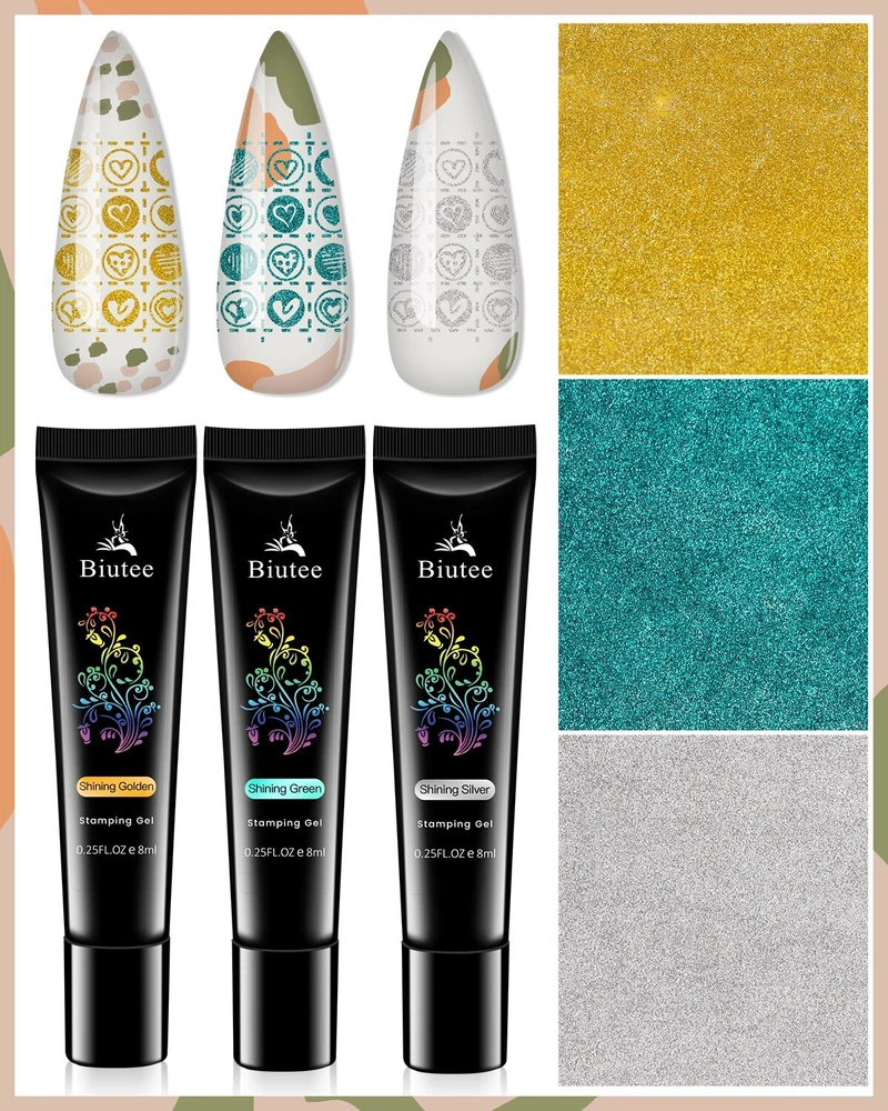 Specification: Brand: Biutee Quantity: 1 Set(12 Colors) Capacity: Approx. 8ml/1pc Package Contents: 12pcs 8ml Biutee Stamping Gel Feature: Special nail gel for nail art stamping and printing colors. Superior Quality and brand new merchandise. Has no requirement for operation speed, more suitable for beginner. Need to cure by UV lamp. How to use: Step 1. Apply base color on the nail with base coat and cure. Step 2. Apply Nail Latex. Step 3. Apply Stamping gel on the stamping plates. Step 4. Use a transparent scratch gel. Step 5. Press the stamper and pick up the pattern. Step 6. Transfer on nails and cure under UV lamp for 2 minutes or under LED lamp for 30-60 seconds. Step 7. Peel of the nail latex. Step 8. Apply top coat and cure under UV lamp for 2 minutes or under LED lamp for 30-60 seconds. Finished.