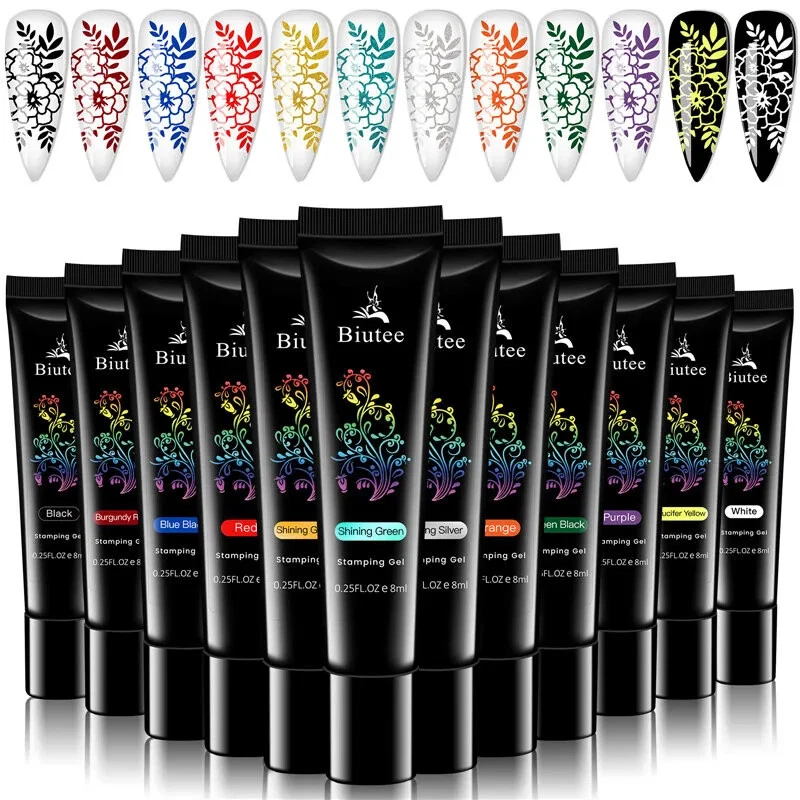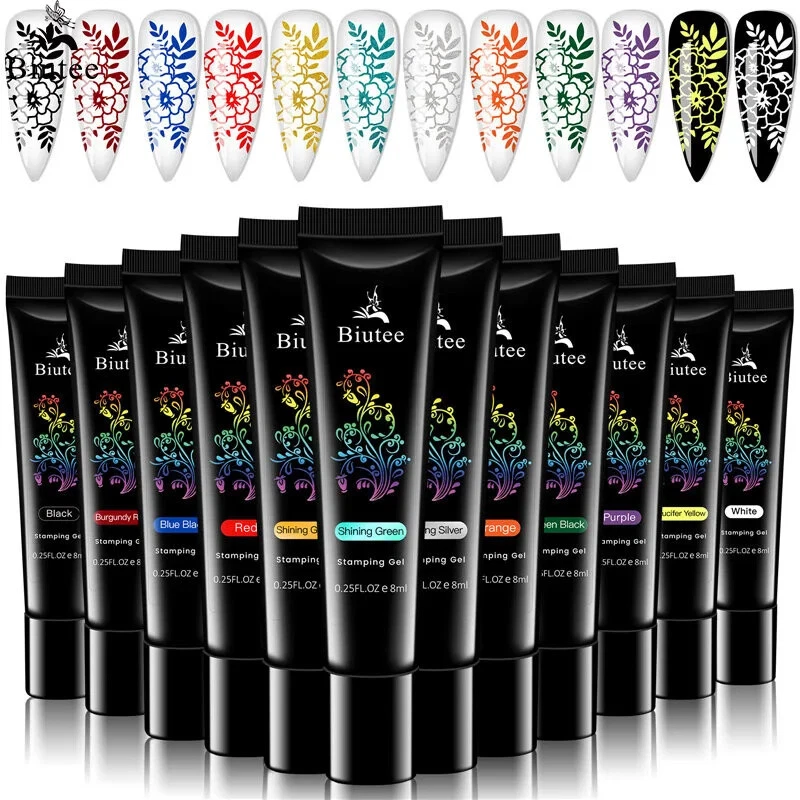 Quantity: 1 Set(12 Colors) Capacity: Approx. 8ml/1pc Package Contents: 12pcs 8ml Biutee Stamping Gel Feature: Special nail gel for nail art stamping and printing colors. Superior Quality and brand new merchandise. Has no requirement for operation speed, more suitable for beginner. Need to cure by UV lamp. How to use: Step 1. Apply base color on the nail with base coat and cure. Step 2. Apply Nail Latex. Step 3. Apply Stamping gel on the stamping plates. Step 4. Use a transparent scratch gel. Step 5. Press the stamper and pick up the pattern. Step 6. Transfer on nails and cure under UV lamp for 2 minutes or under LED lamp for 30-60 seconds. Step 7. Peel of the nail latex. Step 8. Apply top coat and cure under UV lamp for 2 minutes or under LED lamp for 30-60 seconds. Finished.