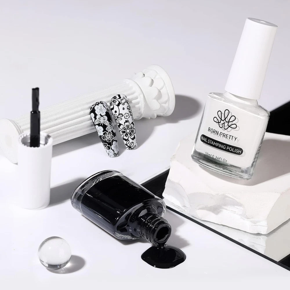 Nail Art Stamping Polish White Black Manicure Image Stamp Polish Set PACKAGE CONTENTS --- There comes with 2 Bottle BORN PRETTY Nail Art Stamping Polish, capacity of 6ml / 0.20fl oz ,This is a set of stamping polish only. NO stampers, scrapers, or nail plates come with these items PERFECT TRANSFER --- Our Nail Stamping Polish is brilliant and fully opague. The nice consistency allows you to make crisp clear images and get a clean transfer when you picked up these colors. USING TIPS---Apply appropriate amount of the nail polish on a stamping plate (nearly 1/3 of the image you want), wipe the excess; QUICKLY pick up the color with a stamper! Then stamp it on your nails quickly. Seal it with no smudge top coat, then your nails should last 14 days if applied correctly. ENVIRONMENTALLY FRIENDLY---We only use environmentally friendly materials, such natural resin, and colorants. Our polish does NOT contain formaldehyde, toluene, DBP, plasticizers or heavy metals Product Description 1.29 inches x 2.93 inches x 0.83 inches. Weight: 0.01 oz Item model number BP-10ml-White+Black Item Form Liquid Special Feature long_wearing Number of Items 2 Color Black White Stamping Polish Finish Type 亮光 Product Dimensions 2.93 x 1.29 x 0.83 inches; 0.01 ounces Material Feature Non-Toxic Age Range (Description) Adult,Kid Is Discontinued By Manufacturer No Type gel Material Type Free Alcohol Free