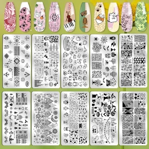 Nail Stamping Plates Set:It includes 10 Nail Stamp Plates + 1 Jelly stamper +1 Replace Head + 8 Stamping polish +1scraper. This is the best gift, you will be shinning on halloween day. Stamping polish : Contains essential colors,8*0.25FL.OZ Stamping polish in different colors ( green, black, white, blue, gold, purple, red, silver). Nail stamp Plates: It is made of high-quality 304 stainless steel. Holiday Theme - The nail stamping plates feature Christmas theme, The template contains Snow, Santa Claus, deer, music, animals, flowers, leaves, and lattice themes. It can also be suitable for daily use in the scene that meets the needs of special festivals. Stamper: Not only can stamp but also French manicure. Transparent silicone material, with clear profile, complete structure and transparent texture all over the body. The location of the profile can be clearly seen. Easy to Use: Peel off the blue protective film, apply nail stamping , scrap off excess and use the nail stamper on it. If you have any questions, please feel free to us, we will give you a satisfactory answer or a full .