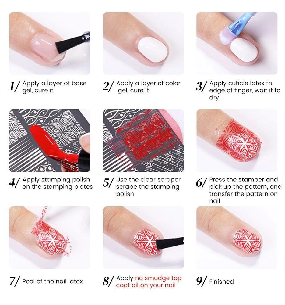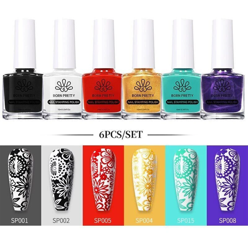 PRODUCT DESCRIPTION: Specification: Brand: BORN PRETTY Type: Stamping Nail Polish Color: 3 Colors for Choose Quantity: 6 Bottles Volume: Approx. 10ml Using Tools: Dry by natural, matched with Stamper&Scraper and Stamping Plates(not including) Package Contents: 6 Bottles 10ml BORN PRETTY Stamping Nail Polish Why Choose Our Nail Polish? Made of high quality material, the nail polish is of high pureness , making your nail with bright colors. Easy to apply, quick-drying. Special nail polish for nail art stamping and printing colors. Simple to use: Shake or stir very well before use. Comes with brush making nail art fast and easy for everyone. Allow you to create beautiful nail designs in short time. How To Use Our Nail Polish? Step 1: Apply the base gel and color polish on your nails. Step 2: Apply the nail latex. Step 3: Apply stamping polish on stamping plates. Step 4: Use scraper to scrape the excessive stamping polish. Step 5: Press the stamper quickly to pick up the pattern. Step 6: The pattern is completed and transfer on nail surface. Step 7: Peel off the nail latex and apply the top coat to finish the nail design.