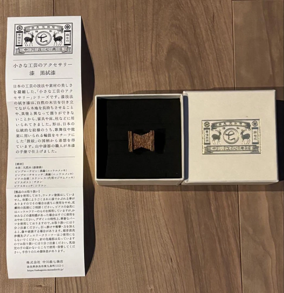 Description Nakagawa Masashichi Shoten black lacquer pin badge small craft accessories This series of small craft accessories condenses the beauty of Japanese craft techniques and materials. After wiping the lacquer technique, it has been used for furniture, floors, pillars, etc. because it brings out the natural grain of the wood and makes the wood last longer, and because it does not change like real wood. The shape is inspired by the tsuzumi-mon pattern, which is a traditional Japanese pattern that is based on the ring drum used in Kabuki and Noh theater. Craftsmen of Yamanaka lacquerware finished it by hand. Material Body: Natural wood (lacquered) Pin proach bin: Brass (nickel plated) Bin pouch catch: true (nickel plated) Via pedestal: Stainless steel (substitute rhodium plating) Via post: titanium Earring catch: silicone If you have any questions, please do not hesitate to ask. ^_^ Policy Payment You can use various payment methods based on eBay Managed Payments. Import duties, taxes and charges are not included in the item price or shipping charges. These charges are the buyer's responsibility. Shipping Expedited Shipping We always send the item with a tracking number. So please place an order without any concern on delivery. You can always track the delivery status. Shipping is only available to the address registered in eBay. If you want us to send another address, please change your address on eBay and then place an order. Shipping is available from Monday to Friday. Weekends are not available because freight companies are closed. Economy Shipping Delivery in 2-4 weeks. It may be delayed depending on the area and weather. Without tracking number. Cancellations & Returns Cancellation or returns will be accepted only if the item has an obvious problem that was not mentioned in the listing description. If that, please let us know within 3 days you got the item. Buyer is responsible for shipping costs and any charge incurred shipping products back. International Buyers Import duties, taxes and charges are not included in the item price or shipping charges. These charges are the buyer's responsibility. Please check with your country's customs office to determine what these additional costs will be prior to bidding/buying. These charges are normally collected by the delivering freight (shipping) company or when you pick the item up - do not confuse them for additional shipping charges.