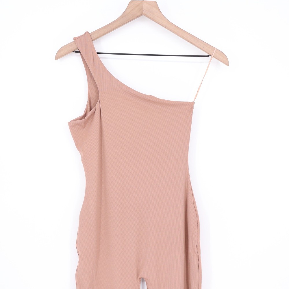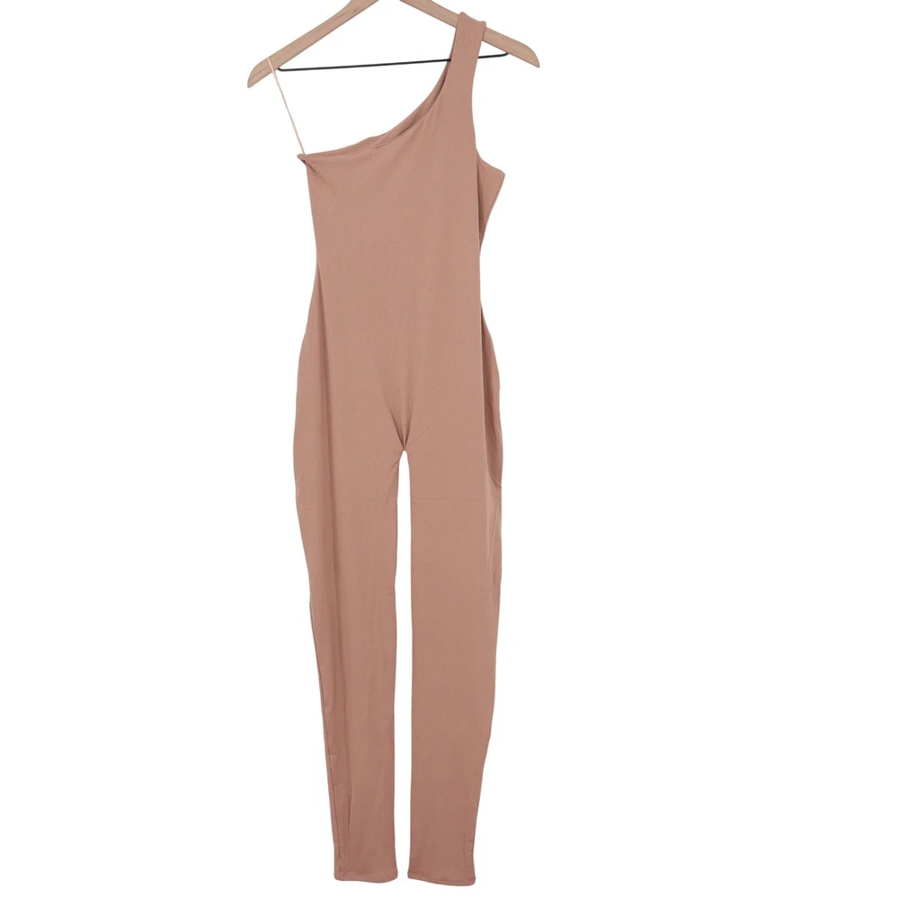 One-shoulder jumpsuit in a coco brown hue offers a sleek, body-hugging silhouette. Crafted from a signature ribbed stretch fabric, this piece features a single broad shoulder strap and a minimalist design that transitions effortlessly from day to night. The full-length legs and seamless-look construction provide a polished, contemporary aesthetic. Brand: Naked Wardrobe Style: NW-J0876 Color: Coco Material: 90% Nylon, 10% Spandex Pattern: Ribbed Neckline: One Shoulder Sleeve Length: Sleeveless Leg Style: Skinny Closure: Pull On Origin: Made in China Measurements: • Chest: 15" (30" doubled) • Length: 55" Keywords: Bodycon, Minimalist, Neutral, Earthy, Streetwear, Clubwear, Athleisure, Ribbed Knit, Sculpting, Chic, Modern, Kim Kardashian Style, Basic, Versatile, Loungewear All orders are shipped the same business day or the next business day. Thank you for supporting my small business.
