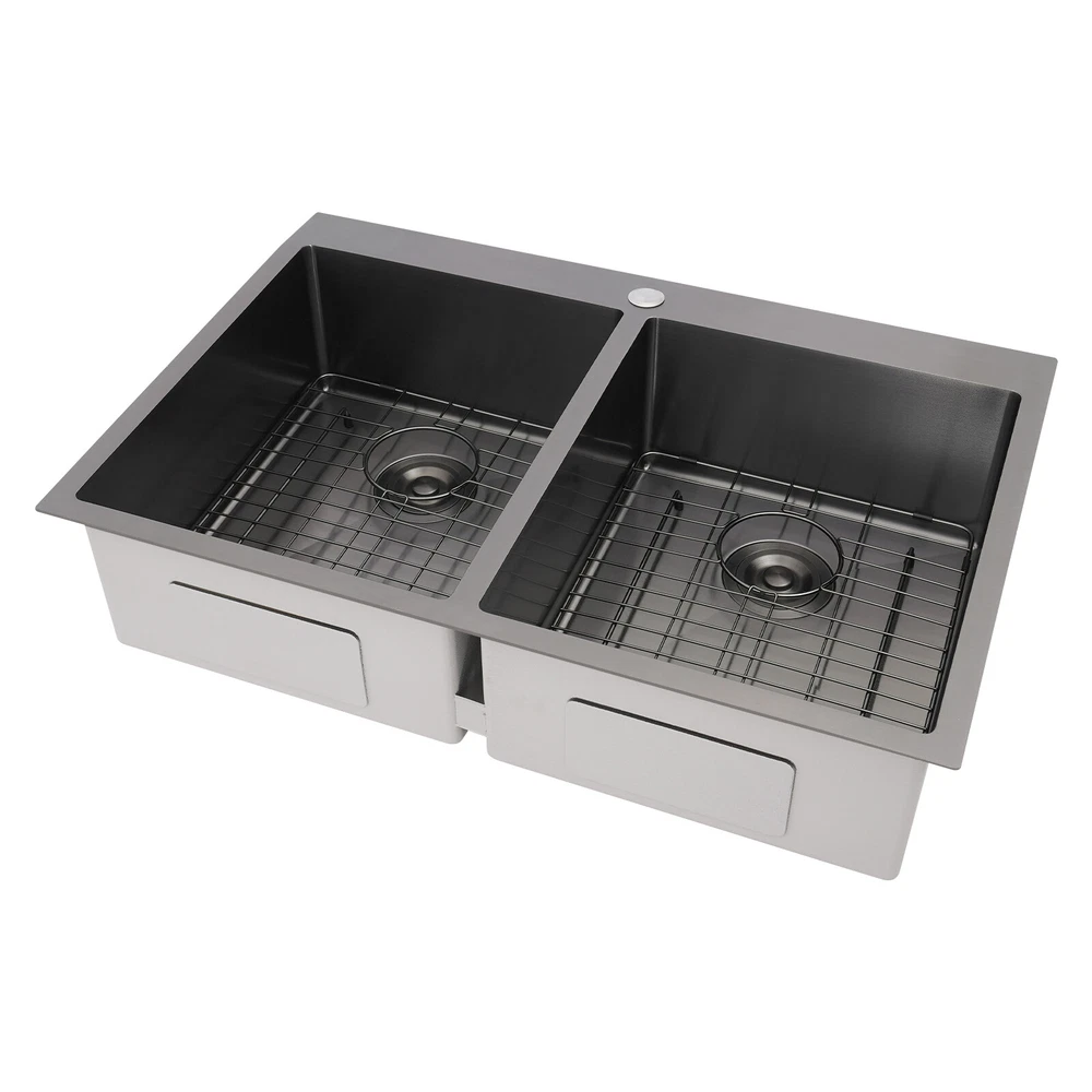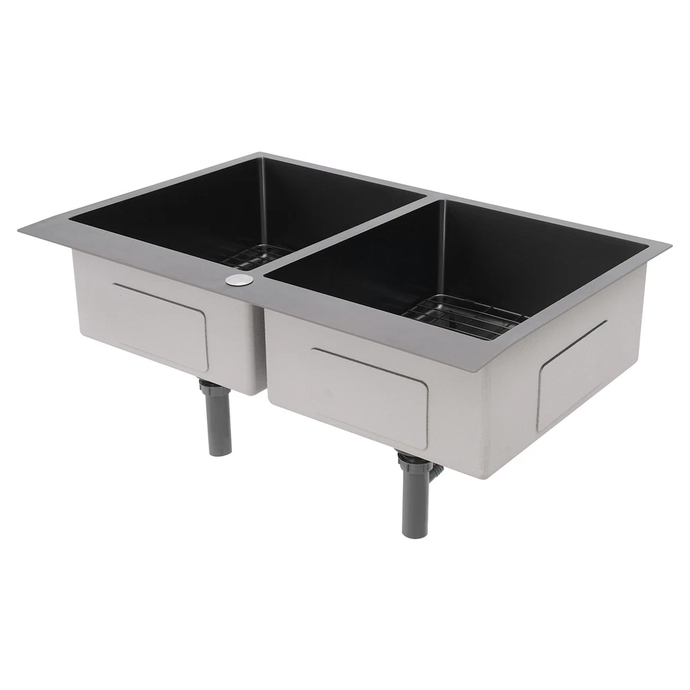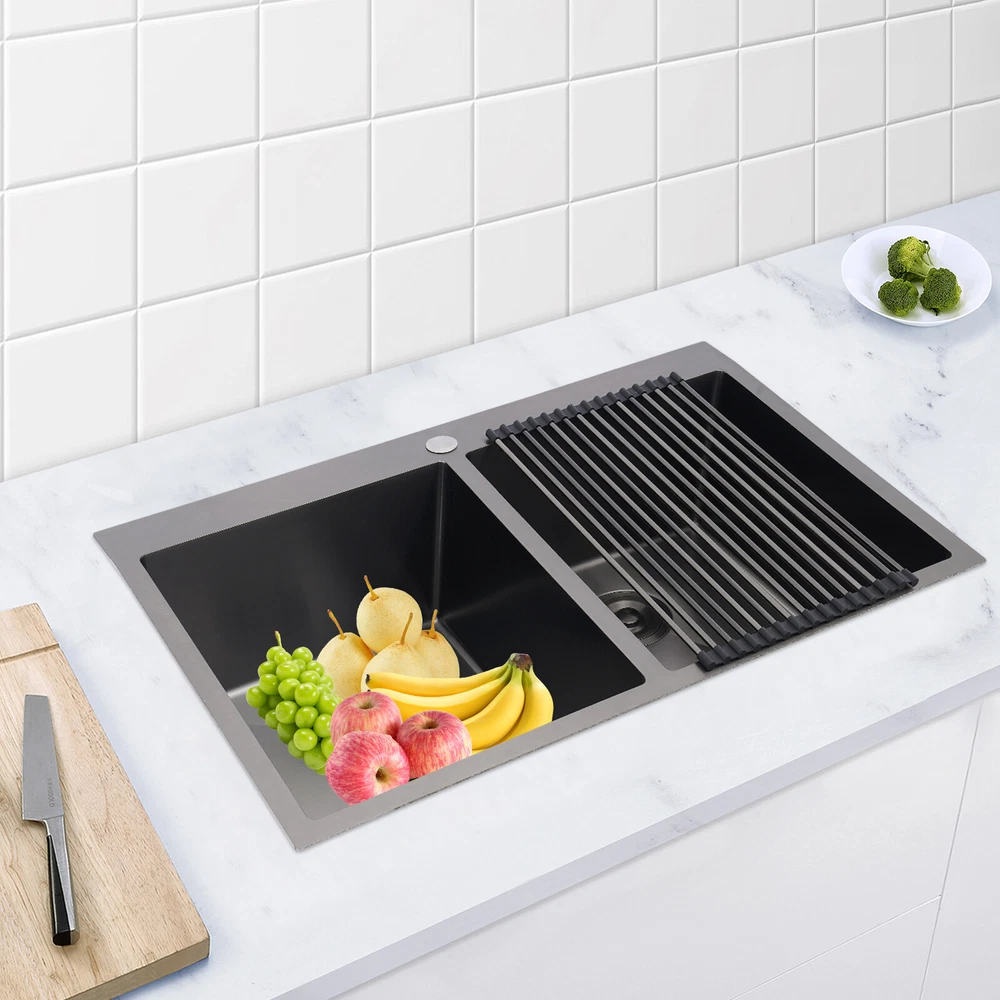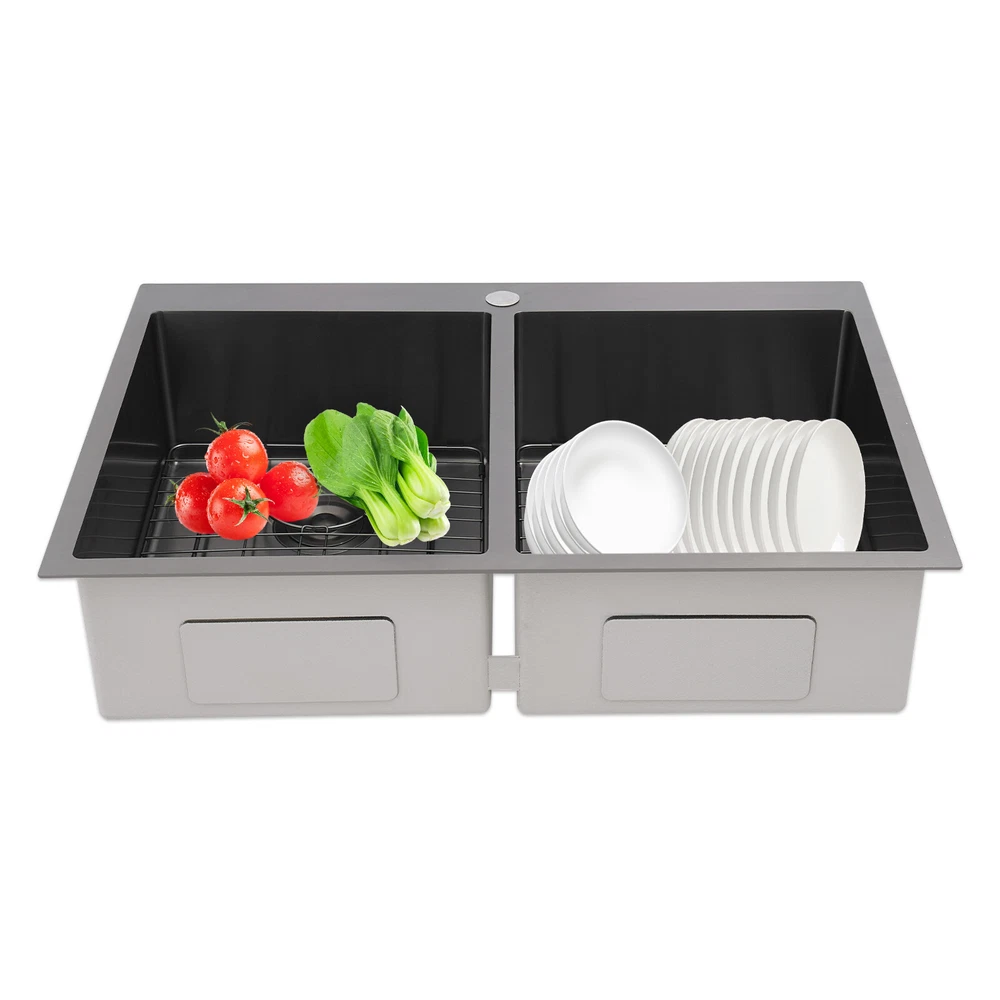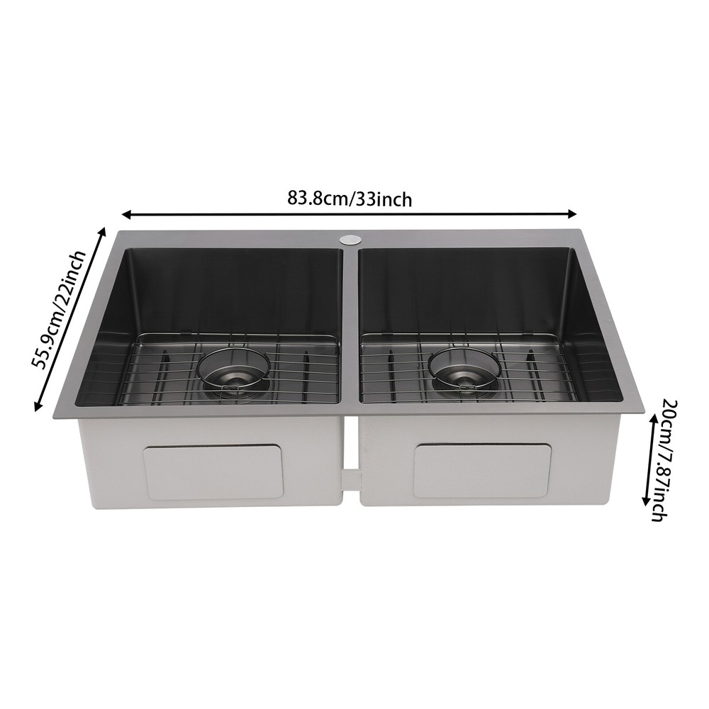 Application This product is suitable for both commercial and residential use and can be used in the kitchen, restaurant, laundry room, school, hospital, and other places. Specification Material: 304 Stainless Steel Color: Black Process: Nano Coating Shape: Rectangular Style: Modern Assembly Required: Yes Mounting Type: Topmount, Flushmount, Undermount Opening Size(Topmount): 81.8*53.9cm/32.2*21.22in Product Size: 83.8*55.9*20cm/33*22*7.87in Package Size: 89*61*29cm/35.04*24.02*11.42in Gross Weight: 10kg/22.05lbs Net Weight: 9.5kg/20.94lbs Package Included 1* Double-Bowl Kitchen Sink 2* Drainage Grids 2 Sets* Drain Strainers 1* Roll-up Drying Rack Nano Stainless Steel Double Bowl Kitchen Sink Scratch-Resistant Topmount Sink Description Are you looking for a convenient and practical kitchen cleaning sink? Please take a look at our double-bowl kitchen sink, which is made of premium 304 stainless steel with a nano-coating process and is robust and durable. Its enlarged and deepened sink alleviates splash problems and provides more space for washing more fruits and vegetables and cooking utensils. Key Features Made to Last: High-class 304 stainless steel and exquisite nano-coating process make this product sturdy, scratch-resistant, impact-resistant, and not easy to corrode and deform, ensuring a long service life. Large Sink Space: The 7.87-inch-depth and double bowl design allow you to clean large amounts of plates, dishes, and pots, and wash fruits, and vegetables at one time without splashing, saving time. Thoughtful Design: It is equipped with sound insulating pads, which can effectively reduce the noise generated by the faucet water release and the collision of dishes, creating a quiet kitchen environment. In addition, the anti-condensation coating can prevent the kitchen cabinet from getting wet and moldy. Quick Drainage: The X-shaped water guiding line can guide water flow and form vortices to achieve rapid drainage. The drain strainer intercepts food and debris for easy disposal and prevents clogging. Easy to Install: Its simple structure and complete installation accessories allow you to easily complete the installation in a short time. In addition, three different mounting ways (topmount, flushmount, undermount) can meet your different needs. Complete Set: This product is a complete set consisting of a double-bowl sink, two drainage grids, two drain strainers, and a roll-up drying rack, which can meet your kitchen cleaning and drainage needs without the need to purchase additional parts, making it very convenient. Stylish Appearance: The low-key black color makes it look modern and stylish to blend in with different decor styles and adds a touch of decor to your space. Effortless Cleaning: Thanks to its smooth surface, rounded corners, and simple construction, you can easily clean it with water and a cloth (not included)! In addition, the thickened nano-coating can reduce oil adsorption, prevent bacterial growth, and make it easier to clean. Buy with Confidence: We stand behind all our guests and look forward to assisting you with your purchase. It is our pleasure to answer your confusion and questions. The end of the story between us is not "we sell and you buy". Details Roll-up Drying Rack: It can be directly placed on the kitchen sink for drying cutlery, cups, and small plates. Practical Drainage Gid: It can effectively protect the bottom of your sink and allow your utensils to drain on the grid. The hole in the middle of it allows you to operate the drain strainer without taking out the grid, making it convenient for you to operate. Application This product is suitable for both commercial and residential use and can be used in the kitchen, restaurant, laundry room, school, hospital, and other places. Specification Material: 304 Stainless Steel Color: Black Process: Nano Coating Shape: Rectangular Style: Modern Assembly Required: Yes Mounting Type: Topmount, Flushmount, Undermount Opening Size(Topmount): 81.8*53.9cm/32.2*21.22in Product Size: 83.8*55.9*20cm/33*22*7.87in Package Size: 89*61*29cm/35.04*24.02*11.42in Gross Weight: 10kg/22.05lbs Net Weight: 9.5kg/20.94lbs Package Included 1* Double-Bowl Kitchen Sink 2* Drainage Grids 2 Sets* Drain Strainers 1* Roll-up Drying Rack Notes Please check the size carefully before ordering. Please note that to prolong the life of the sink, do not scratch the surface with sharp objects. If you want to get a better installation result, we recommend that you hire a professional worker to install it. Please allow the slight color difference caused by the shooting light and 1-3cm error due to manual measurement, and make sure you do not mind before you order. Payment Delivery details Terms of sales About us Contact us Payment We accept ebay payment 。 Fees such as import duties, taxes are not included in the item price or shipping costs. These charges are the buyer's responsibility. Delivery details Shipping: 2-9 working days to: USA Terms of sales We maintain high standards of excellence and strive for hundred percent customer satisfaction. Feedback is very important to us. We hope that you contact us immediately before you give neutral or negative feedback, so that we can address your concerns. It is impossible to address issues if we do not know about them! About us Your satis faction is our ultimate goal. We work hard to earn your trust and future business. Our certified technicians have tested each item before shipping. The unit comes with 1 year limited warranty on all manufacturing defects. a) If you receive a defective item, you may return it or ask for a discount. Please contact us within 14 days after you receive the package. b) What you returned must be intact and in its original packaging as re? u. Customer is responsible for shipping costs of the returned item. c) We will cover the cost of shipping back t with the shipping rate indicated in the registration page. We will send you a new unit or refund the full payment you paid. Tha