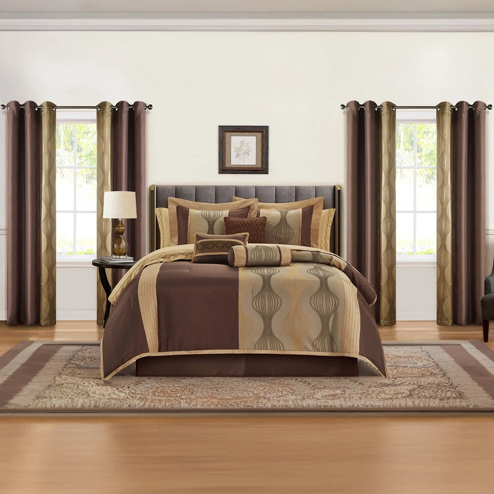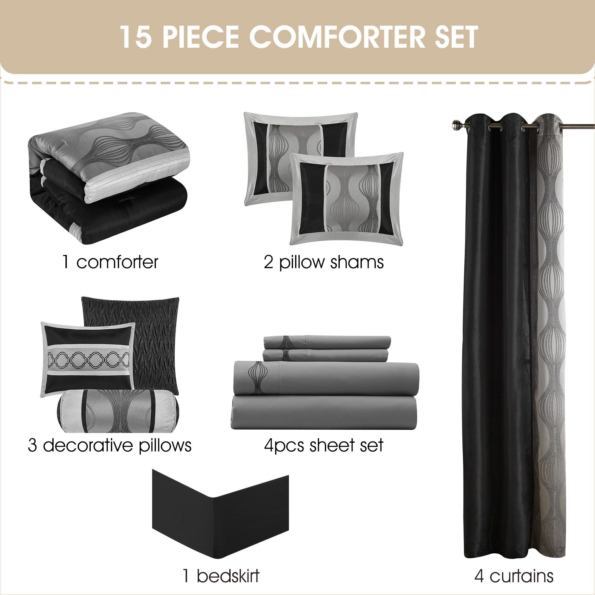 Complete your bedroom makeover with our exquisite 15-Piece Room-in-a-Bag Set, a perfect fusion of style and comfort. This thoughtfully curated collection showcases a captivating blend of patchwork and geometric patterns that add a modern, eye-catching flair to your space. Featuring a plush comforter, a stylish bedskirt, two chic pillow shams, three decorative pillows, two soft pillowcases, a smooth flat sheet, a snug fitted sheet, and four matching curtains, this set stands out as the perfect choice for giving your room a luxurious look. Material: 100% Polyester Set Includes: (1) Comforter, (1) Bed skirt, (2) Pillow Shams, (3) Decorative Pillows, (2) Pillow Cases, (1) Flat Sheet, (1) Fitted Sheet, (4) Curtains Care Instructions: Machine wash cold, gently and separately. Do not bleach. Free Shipping Over $49.99* Details Nanshing Daniella 15 Piece Modern Geometric Room-In-A-Bag Product Description: Complete your bedroom makeover with our exquisite 15-Piece Room-in-a-Bag Set, a perfect fusion of style and comfort. This thoughtfully curated collection showcases a captivating blend of patchwork and geometric patterns that add a modern, eye-catching flair to your space. Featuring a plush comforter, a stylish bedskirt, two chic pillow shams, three decorative pillows, two soft pillowcases, a smooth flat sheet, a snug fitted sheet, and four matching curtains, this set stands out as the perfect choice for giving your room a luxurious look. Material100% Polyester Set Includes: (1) Comforter, (1) Bed skirt, (2) Pillow Shams, (3) Decorative Pillows, (2) Pillow Cases, (1) Flat Sheet, (1) Fitted Sheet, (4) Curtains Care Instructions: Machine wash cold, gently and separately. Do not bleach. Tumble dry low. Remove promptly. Do not iron. California King Dimensions 1 Comforter- 104" x 92" 1 Bed skirt - 72" x 84" + 15" drop 2 Pillow Shams - 21" x 37" + 3" 3 Decorative Pillows -1-16" x 16" 1-12" x 16", 1-6.5" x 16" 2 Pillow Cases - 20" x 40" 1 Flat Sheet - 108" x 102" 1 Fitted Sheet - 72" x 84 + 14" height 4 Curtains - 37 x 84" King Dimensions 1 Comforter- 104" x 92" 1 Bed skirt - 72" x 84" + 15" drop 2 Pillow Shams - 21" x 37" + 3" 3 Decorative Pillows -1-16" x 16" 1-12" x 16", 1-6.5" x 16" 2 Pillow Cases - 20" x 40" 1 Flat Sheet - 108" x 102" 1 Fitted Sheet - 72" x 84 + 14" height 4 Curtains - 37 x 84" Queen Dimensions 1 Comforter- 90" x 92" 1 Bed skirt - 60" x 80" + 15" drop 2 Pillow Shams - 21" x 27" + 3" 3 Decorative Pillows -1-16" x 16" 1-12" x 16", 1-6.5" x 16" 2 Pillow Cases - 20" x 30" 1 Flat Sheet - 90" x 102" 1 Fitted Sheet - 60" x 80" + 14" height 4 Curtains - 37" x 84"