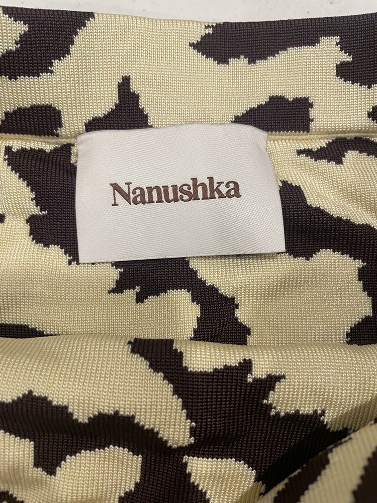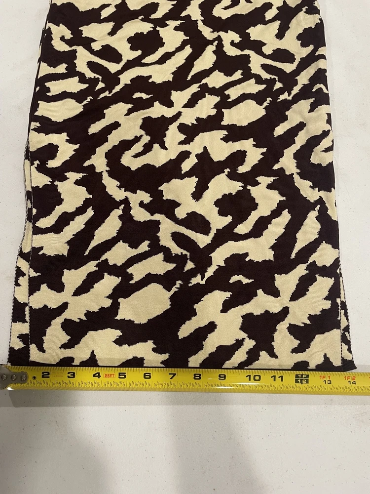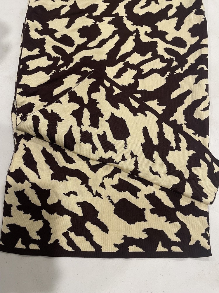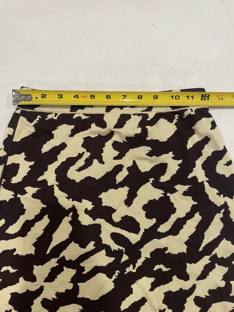 The Nanushka Women's Brown Jenny Bodycon Midi Skirt in size S is a versatile and stylish piece perfect for various occasions. Made from a blend of spandex and rayon, this skirt features a striking animal print pattern in brown, adding a touch of art and creativity to your wardrobe. With a pull-on closure and elastic waist, it offers a comfortable fit that is both stretchy and flattering. The double slit detail adds a unique flair to the bodycon style, making it a standout piece for any season. See pictures for quality and measurements.