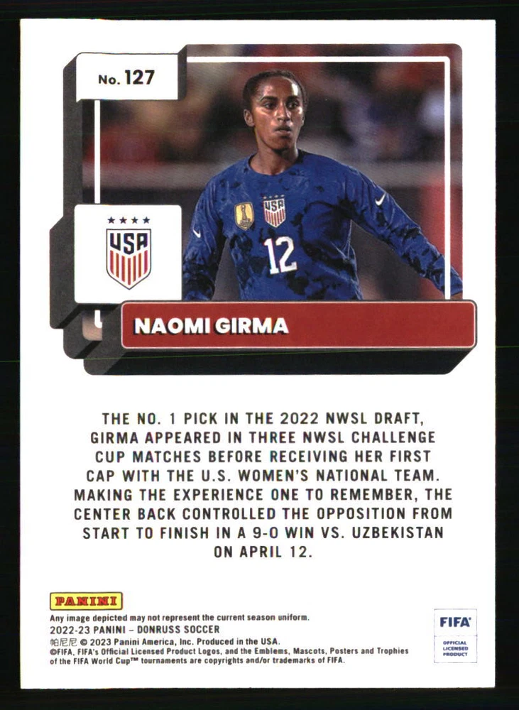 Graded: No Sport: SOCCER Insert Set: Orange Manufacturer: Donruss Type: Sports Trading Card Player|Athlete: Naomi Girma Set: 2022-23 Donruss Team: USA Card Number: 127 Year Manufactured: 2022 Season: 2022 Autographed: No