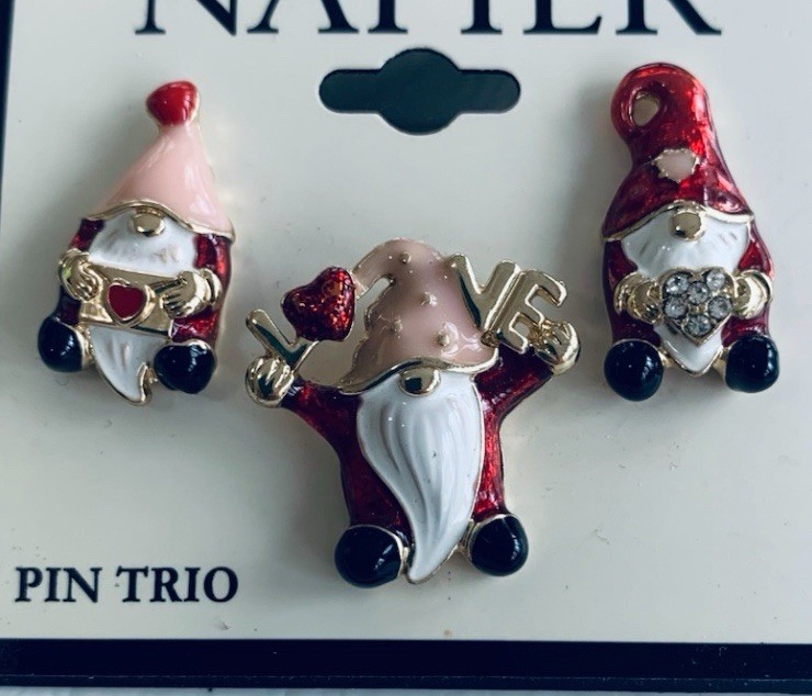 Handmade: No Color: Multicolor Brand: Napier Main Stone Color: N/A Signed: No Customized: No Vintage: No Type: Pin Theme: Gnomes, Love, Valentine's Day Occasion: Anniversary, Valentine's Day Antique: No Country of Origin: Vietnam Main Stone: Crystal Key Words: Napier, Gnomes, Love, Valentine, Trio Set, Fun, Whimsical, Personalize: No Features: Triple Pin Set Materials sourced from: Vietnam Shape: Gnomes Material: Alloy