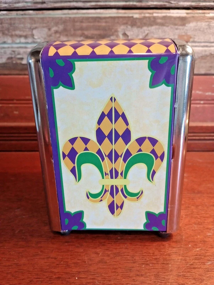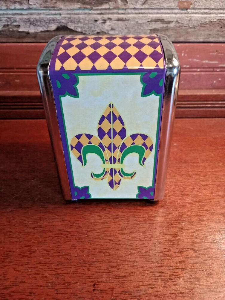 Napkin Holder Dispenser Flour de Lis Mardi Gras Colors ~ New Orleans Diner Style ~ 5 1/2" tall x 4" x 3 1/2". Beautiful and gently displayed. Please contact us directly for any questions, concerns or issues with condition , shipper/carrier delays, etc. and we will work to resolve . Opening a case will only delay our ability to quickly resolve any issues you might have. We strive for 100% customer satisfaction and have an excellent track record . Purchase with confidence. For USA buyers outside the continental USA there may be an additional cost for shipping. Please contact us for the estimated shipping cost. For international buyers our estimated shipping cost is to EBAY's National Shipping Center on the American east coast. EBAY will provide you the additional cost to ship to your location. We sell "used" items in most cases, sometimes new. There are however some items manufactured in previous years that were never used. If such an item is in excellent condition and still has an original price tag, original packaging and in some cases the original box we will show it as a new item but describe it as "new old stock" . We obtain our items through estate sales, storage sales, individuals, auctions and various other means . We sometimes do not know the history of the items we obtain as to how it was stored, who previously owned it, etc. Items are generally unique but we do buy multiples in some cases. We do research every item but are not experts on every item obtained. We do our best to describe each item accurately. USED CHINA AND DINNERWARE HAS NOT BEEN THOROUGHLY WASHED. PLEASE WASH BEFORE USING. NOTE: I describe and post photos of my items as best as possible and do not try to represent myself as an expert on anything that I sell . I am an honest seller and if I see a flaw, I will point it out and try to post a photo for your review and consideration. Used items are not perfect, not mint or near mint and can have scratches, marks, crazing, glaze flaws, trim wear, stains and general wear. Some items we sell have general wear consistent with age and other items do not show their age nearly as much. Please review our pictures as they are an important part of our condition description. If you receive an item that is damaged in some way let us know right away as shippers can be very rough on items shipped. Depending on the type of item we try to "double box" sensitive items to prevent damage. In many cases carefully wrapping the item in bubble wrap or other wrapping is enough protection . IF ANY SHIPPING DAMAGE OCCURS WHEN MULITIPLE ITEMS ARE SHIPPED TOGETHER, INCLUDING SETS, INSURANCE ONLY PAYS FOR THE DAMAGED ITEM ONLY.. NOT THE ENTIRE SET. YOU WILL ONLY BE REFUNDED FOR THE DAMAGED PIECE ONLY. THE AMOUNT OF REFUND WILL BE DETERMINED BY DIVIDING THE NUMBER OF PIECES SHIPPED BY THE SELLING PRICE. REFUND WILL NOT BE BASED ON SIZE OF THE DAMAGED ITEM . I ship in recycled packaging when possible to reduce waste. If there is a problem, please contact me before leaving feedback. SHIPPING: I SHIP GLASS, CHINA AND OTHER FRAGILE ITEMS VIA FEDEX.