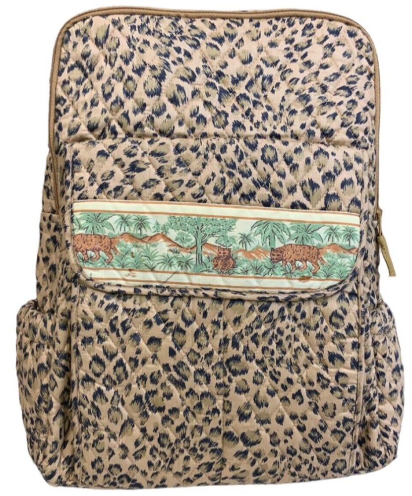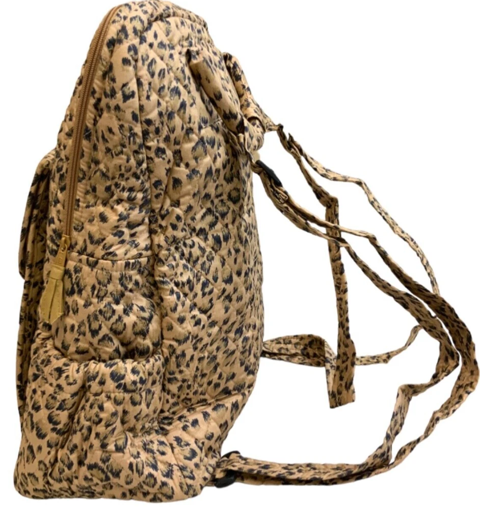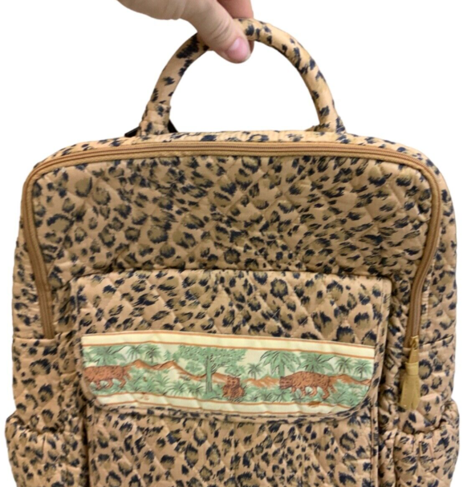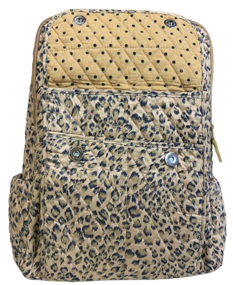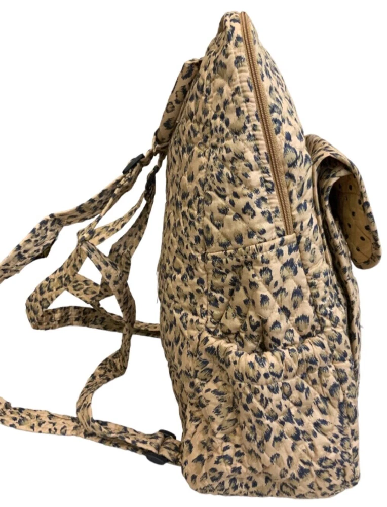 Naples Bag Co. Leopard Print Quilted Backpack Approx 14 inches long Approx 5 inches wide Approx 15 inches high Handle approx 3 inches high Back straps approx 25 inches long Back straps approx 17 inches short Backpack has a Leopard Print pattern. The front has two magnetic snaps that opens to two long pockets and a medium pocket. Each side has a stretchy elastic little pocket. Main part of backpack opens with a single zipper. Inside there’s a dark yellow with polka dots. Also inside has a little open pocket with a little zipper pocket on it and the pattern match’s the outer pattern of the Backpack. The back has two adjustable back straps that you can adjust to how long or short you want the backpack to hang from your shoulders. On top of the backpack is a little handle to make it easier to pick up or move around.
