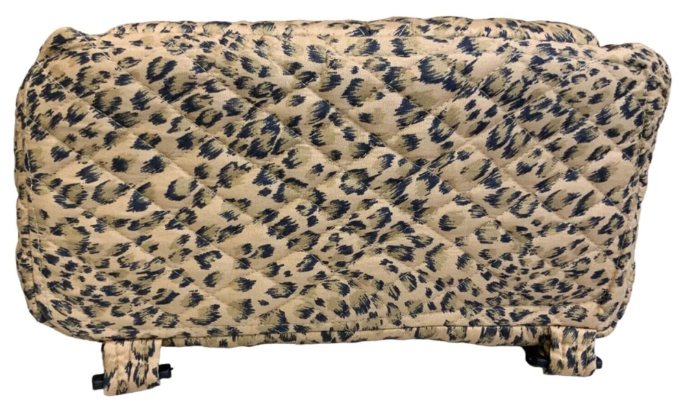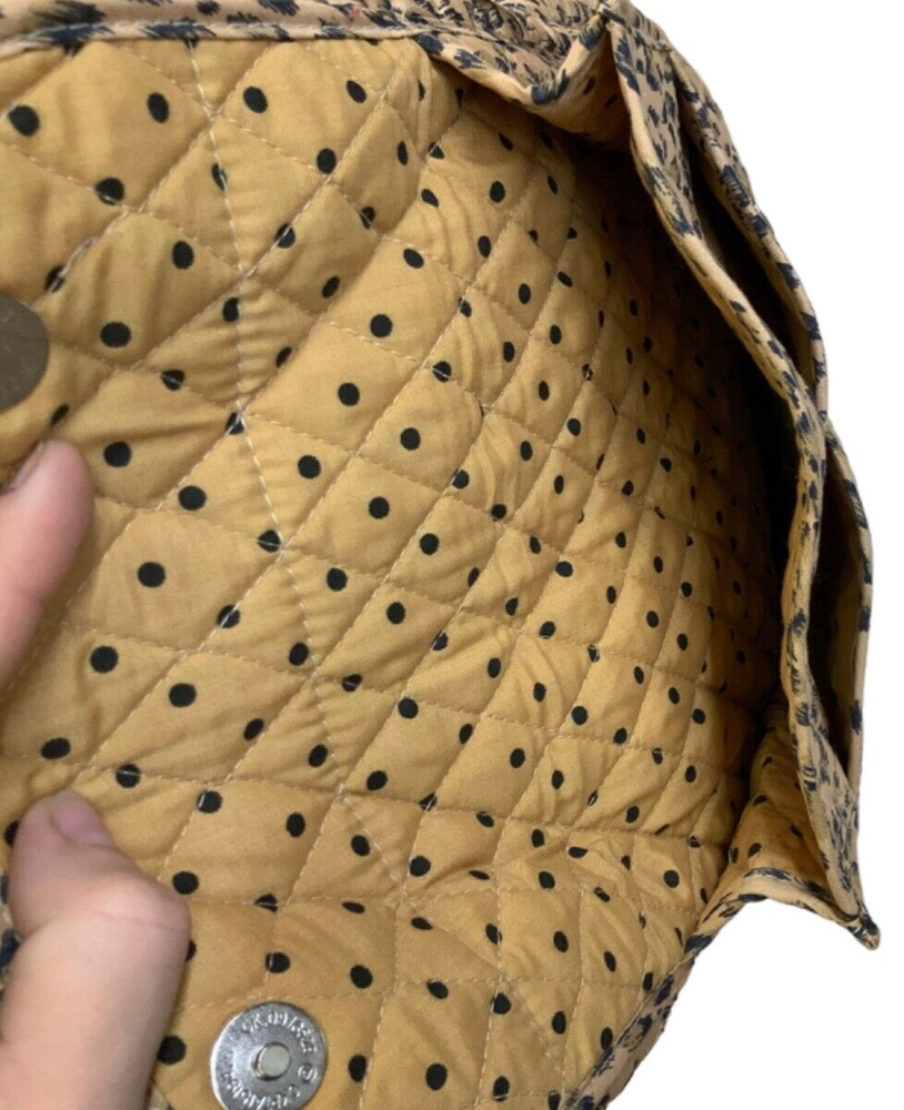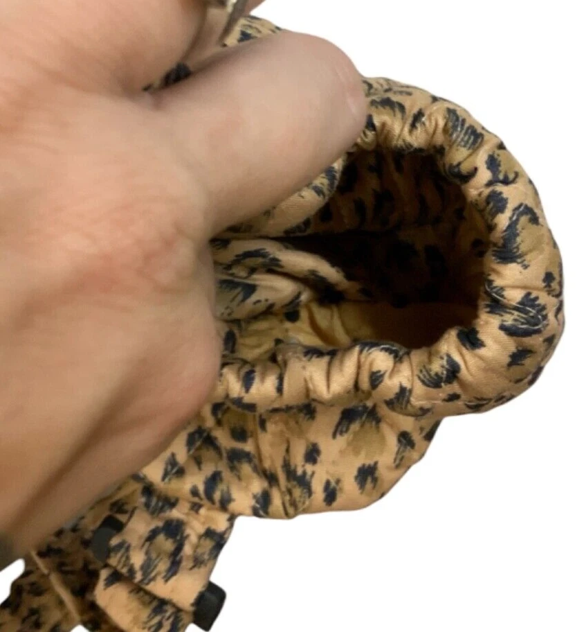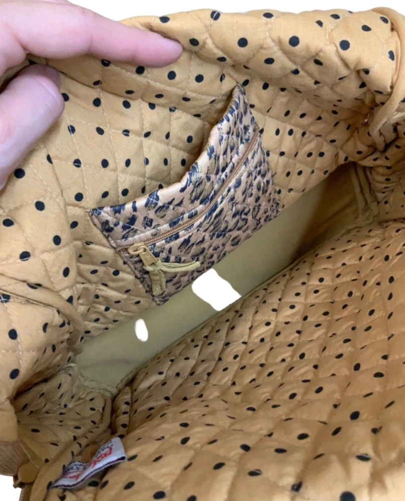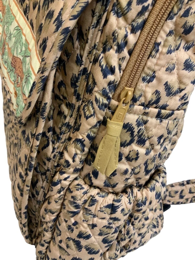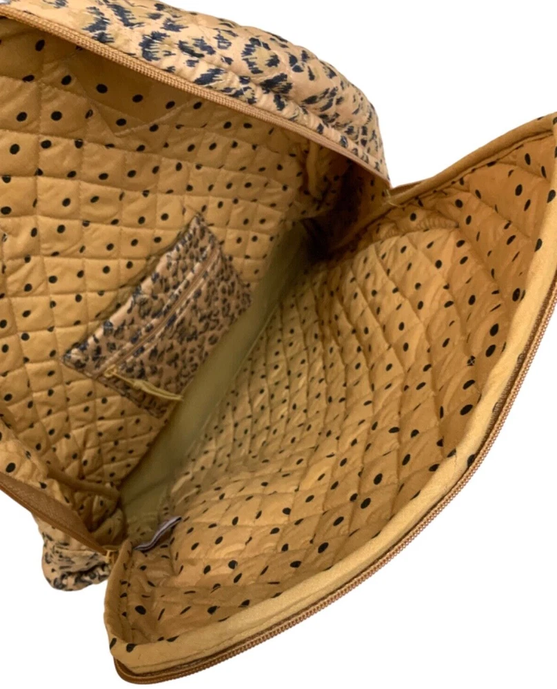 Naples Bag Co. Leopard Print Quilted Backpack Approx 14 inches long Approx 5 inches wide Approx 15 inches high Handle approx 3 inches high Back straps approx 25 inches long Back straps approx 17 inches short Backpack has a Leopard Print pattern. The front has two magnetic snaps that opens to two long pockets and a medium pocket. Each side has a stretchy elastic little pocket. Main part of backpack opens with a single zipper. Inside there’s a dark yellow with polka dots. Also inside has a little open pocket with a little zipper pocket on it and the pattern match’s the outer pattern of the Backpack. The back has two adjustable back straps that you can adjust to how long or short you want the backpack to hang from your shoulders. On top of the backpack is a little handle to make it easier to pick up or move around.
