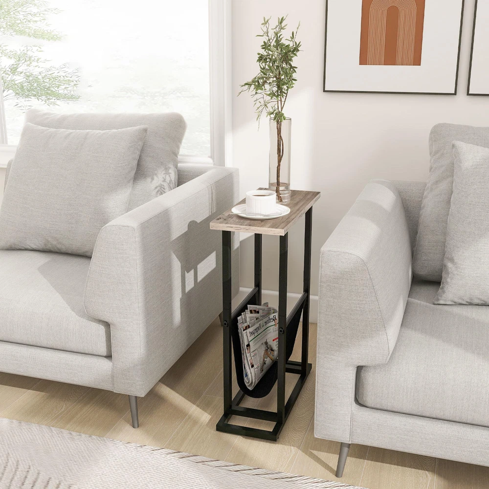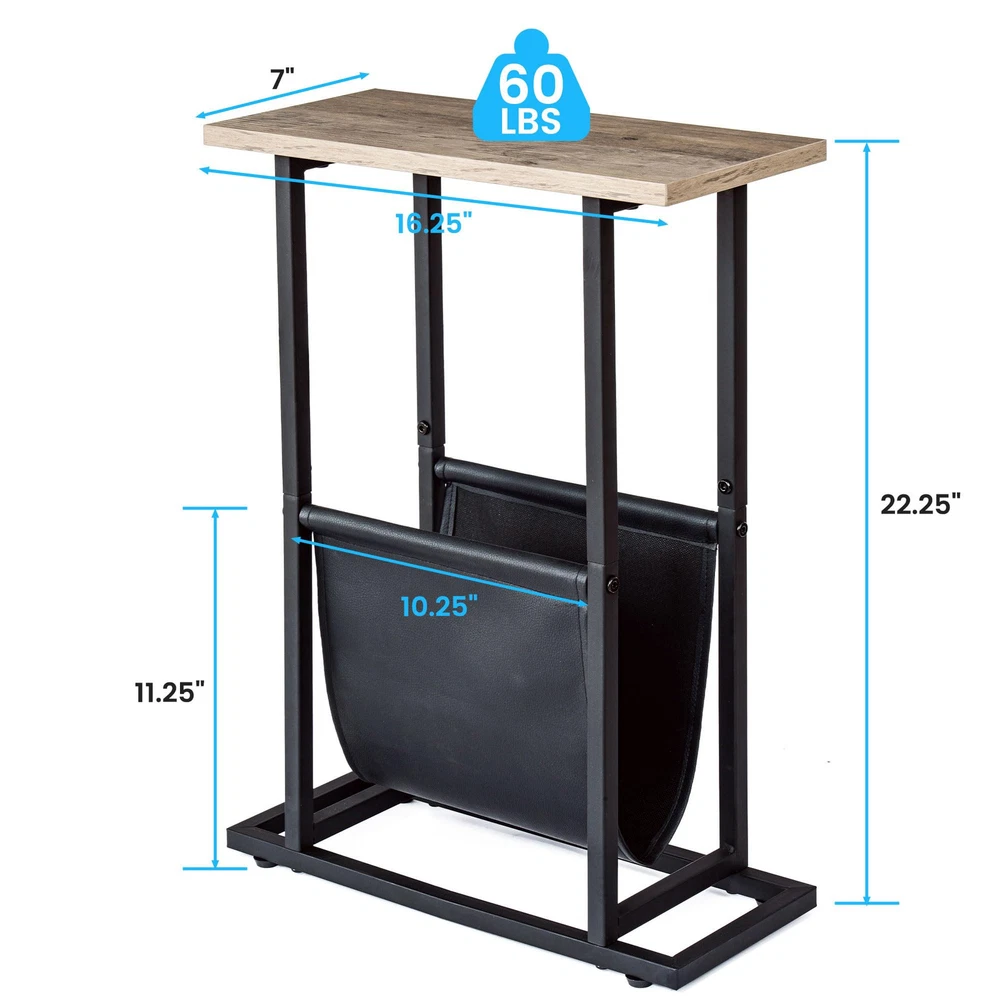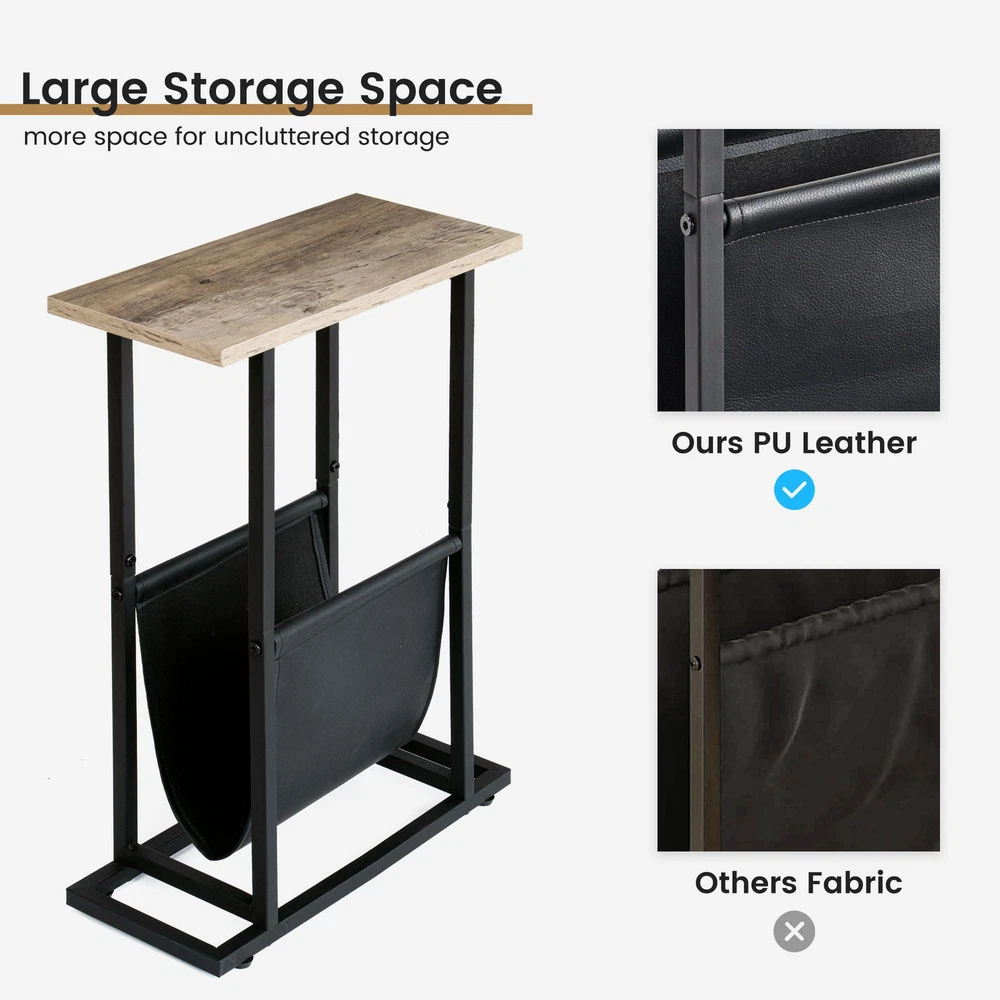 【Multiple Uses】Compact size, space-saving design crafted with a sturdy frame and durable P2 Particle board for long lasting,the small end table can be used as side table, end tables, snack tables, couch tables, drink tables, nightstands or bedside tables for living room, bedroom or home office. 【Improved Durability & Reliability】Constructed of heavy-duty metal frame and durable manufactured wood, this industrial narrow side table has long service life. The retro finish is scratch-resistant and wear-resistant, while can hold up to 60 lb. 【Side Table with Storage】Overall Dimension of this sofa side table is 16.25"W x 7"D x 22.25"H. This couch table with PU bag provides more space for the laptop, magazines, books, etc. 【Perfect for Any Small Space】 With 22.25 inch tall, this narrow sofa side table is suitable for any small space in your home. 4 Adjustable Feet add the extra stability to this snack table and prevent your floor from scratches 【Easy to Assemble】The side table comes with complete accessories and manual, you can assemble in 10 minutes. If you have any questions please feel free to contact us, we will reply you within 24H.