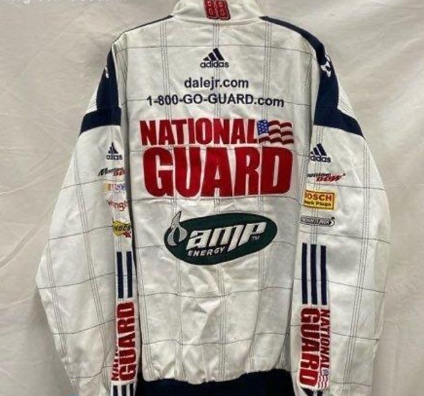 The Nascar Chase Authentics Jacket featuring Dale Earnhardt Jr and the National Guard is a rare find in size 4XL. This white jacket with the driver's name and team logo is perfect for any NASCAR fan looking to show their support for Dale Earnhardt Jr and his team, Hendrick Motorsports. Made for unisex adults, this jacket is a great addition to any racing enthusiast's collection.