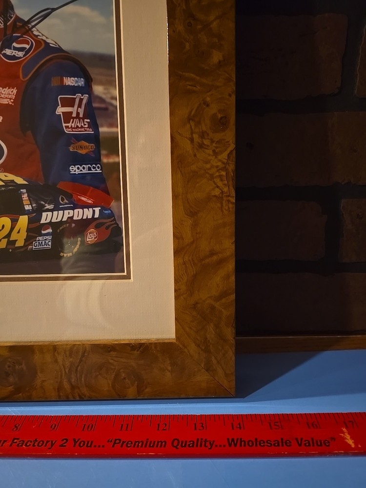 The product is an autographed 8 x 10 photo of Jeff Gordon #24, matted in a 14 x 17 frame. This original photo features the signature of Jeff Gordon, a legendary NASCAR driver associated with the Hendrick team. Although the autograph authentication is not mentioned, fans of racing and Gordon can appreciate the authenticity of this unique collectible item that captures a moment in racing history.