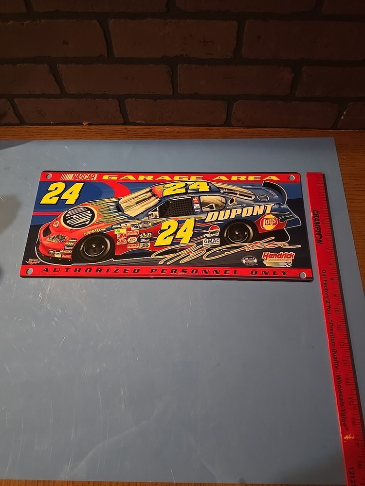 The Nascar Jeff Gordon #24 Garage Area Sign is an officially licensed product featuring Jeff Gordon's car number and team, Hendrick Motorsports. Made by WinCraft, this sign is perfect for any fan of auto racing, specifically NASCAR. The 19 x 8 size makes it a great addition to any racing-themed garage or collection, showcasing team pride for Jeff Gordon and the NASCAR league. Perfect for displaying support for Jeff Gordon and the Hendrick Motorsports team in an attractive and authentic way.