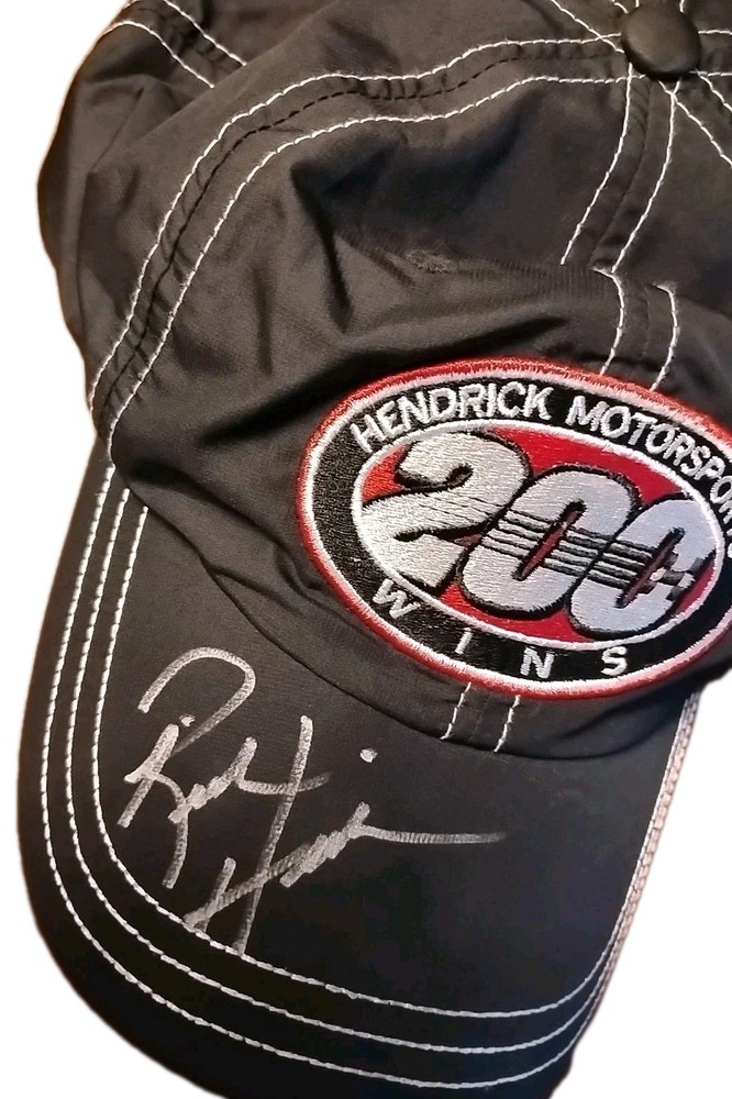 The product is a rare autographed Team Racing 200 wins strapback cap hat featuring NASCAR driver Jimmie Johnson and his Hendrick Motorsports team. The black hat is adjustable in size, making it suitable for fans of auto racing and NASCAR looking to support their favorite driver and team. This unique and collectible item is a must-have for any racing enthusiast who wants to show their admiration for the sport and the talented driver.