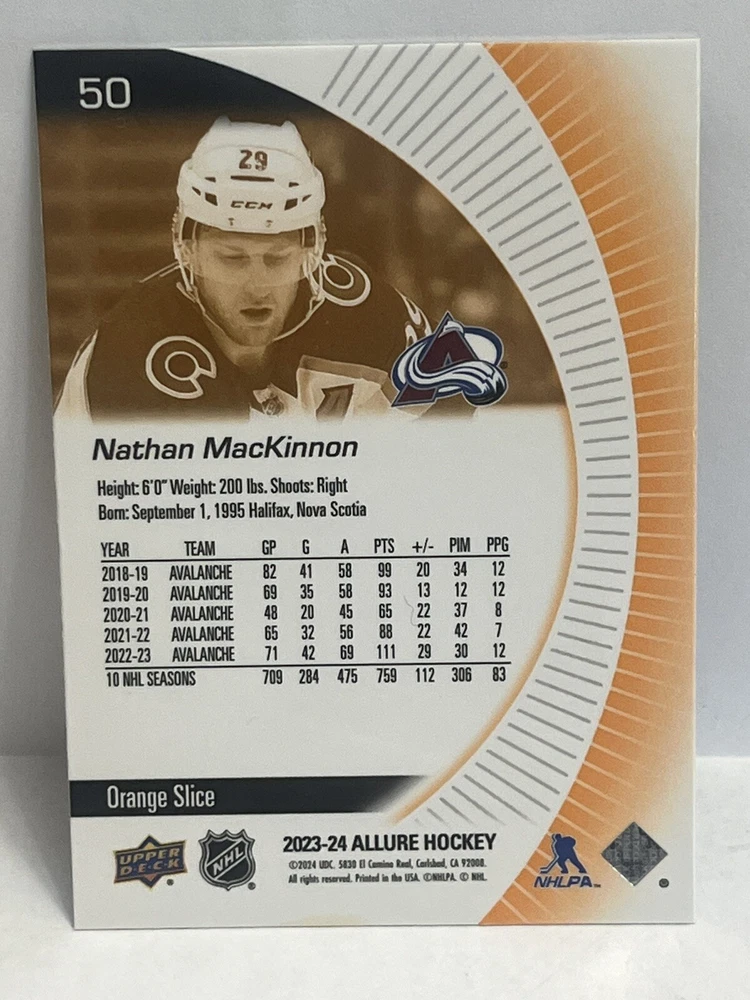 Nathan MacKinnon 2023-24 Upper Deck Allure Red and Black Rainbow & Orange Slice-3 Card Lot. This listing features two cards of Nathan MacKinnon from the Colorado Avalanche in the National Hockey League. The cards are from the 2023 season, manufactured by Upper Deck, and are part of the Allure Red and Black Rainbow set. All cards are made of card stock and are in English language, with the Red Rainbow card numbered 50. Perfect for any hockey fan or card collector looking to add these unique pieces to their collection. Selling 3 cards . Seller is not responsible for lost or damaged cards delivered by mail and any delay in shipping.