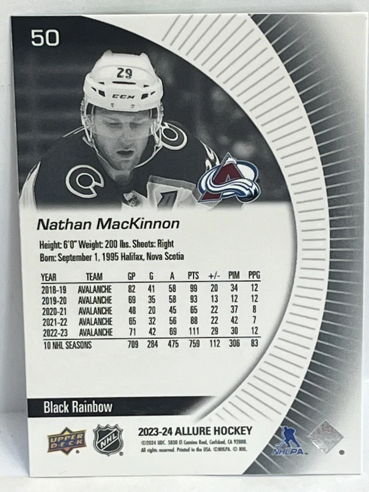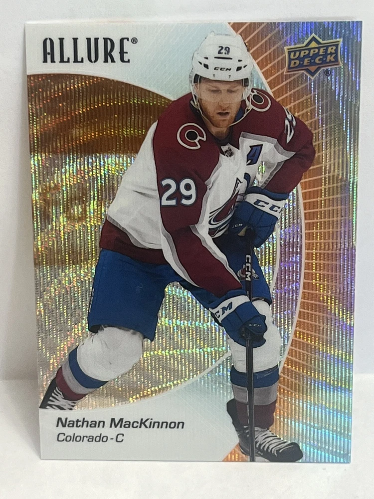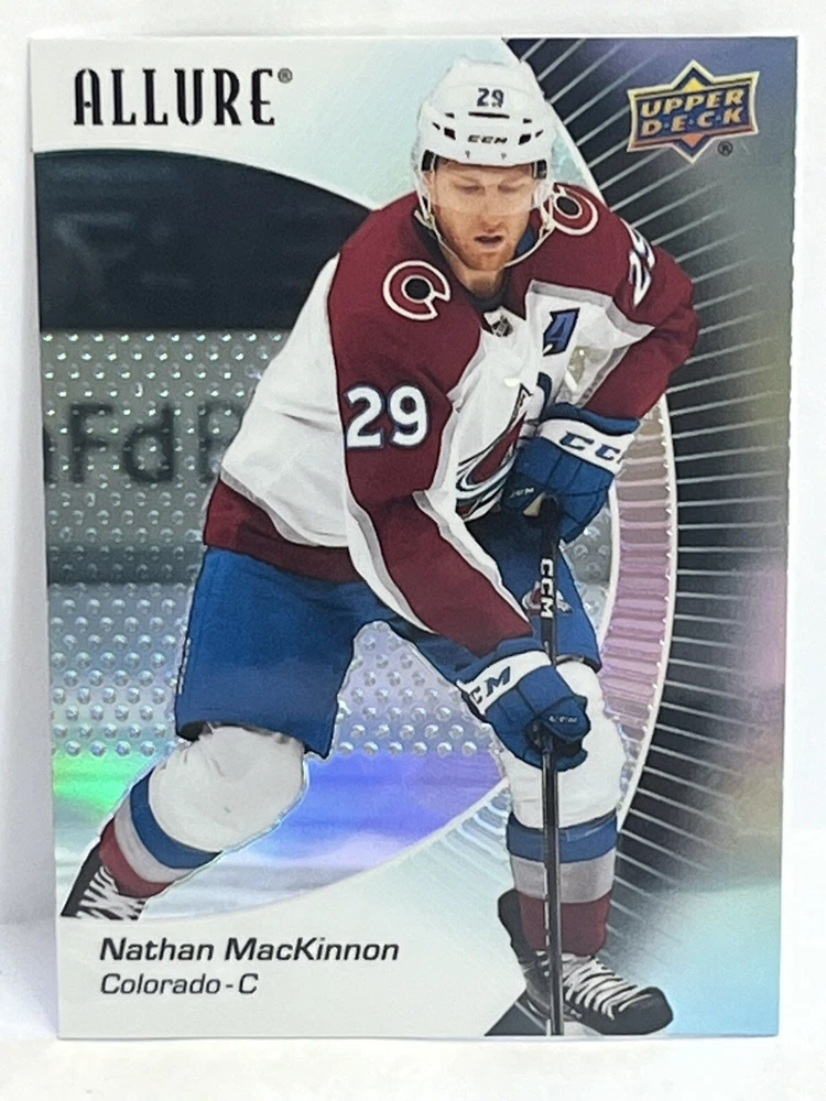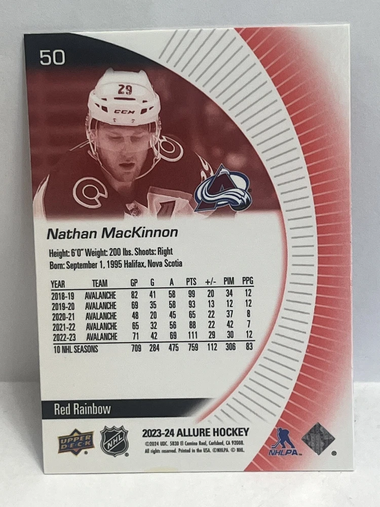 Franchise: Hockey Player/Athlete: Nathan MacKinnon Team: Colorado Avalanche League: National Hockey League (NHL) Vintage: No Season: 2023 Sport: Hockey Type: Sports Trading Card Original/Licensed Reprint: Original Game: Unspecified Material: Card Stock Autographed: No Card Number: 50 Year Manufactured: 2024 Set: Upper Deck Allure Red Rainbow Parallel/Variety: Rainbow Card Size: Standard Manufacturer: Upper Deck Country/Region of Manufacture: United States Language: English Character: Nathan MacKinnon Card Name: Nathan MacKinnon 2023-24 Upper Deck Allure Red Rainbow #50 Colora