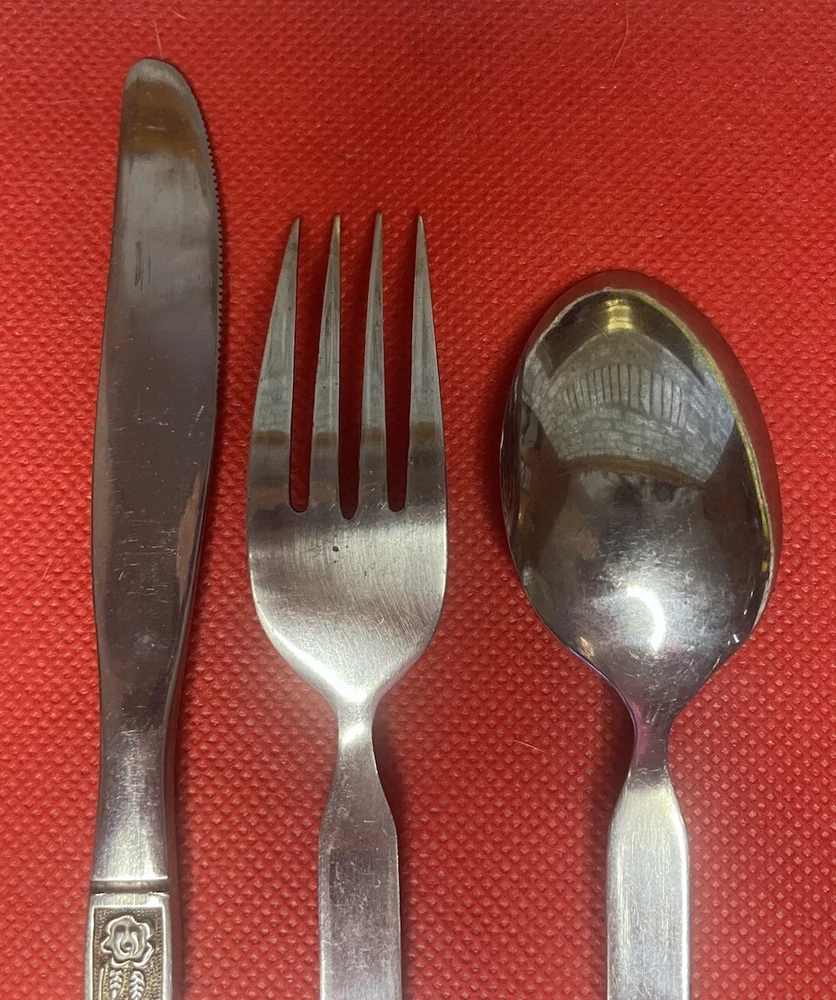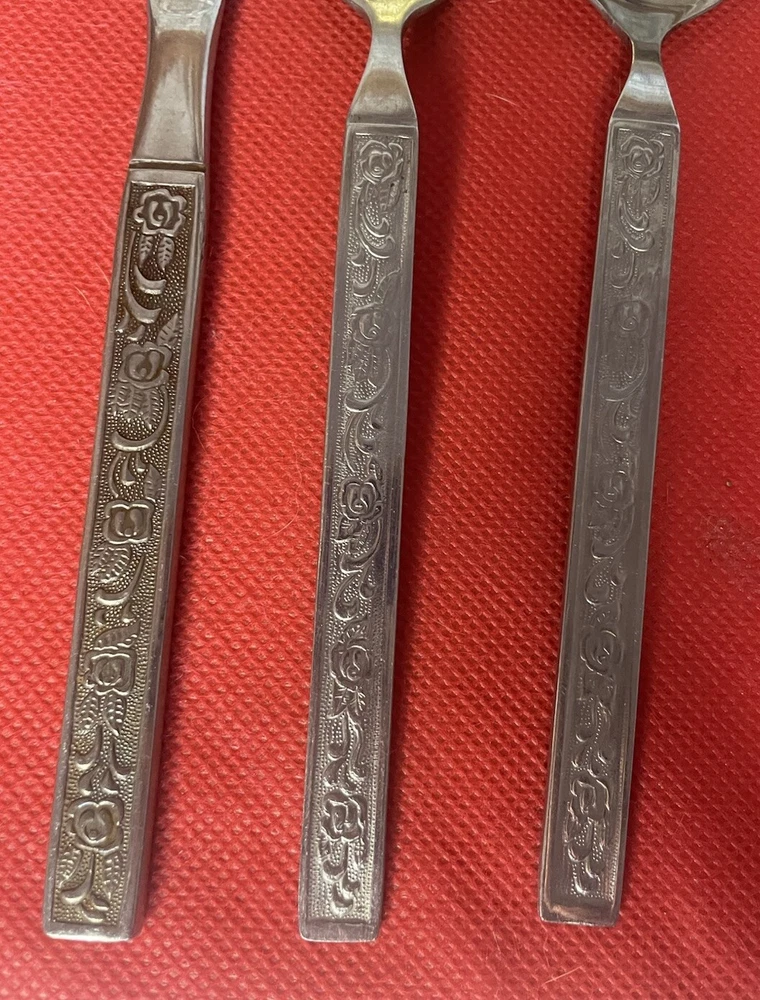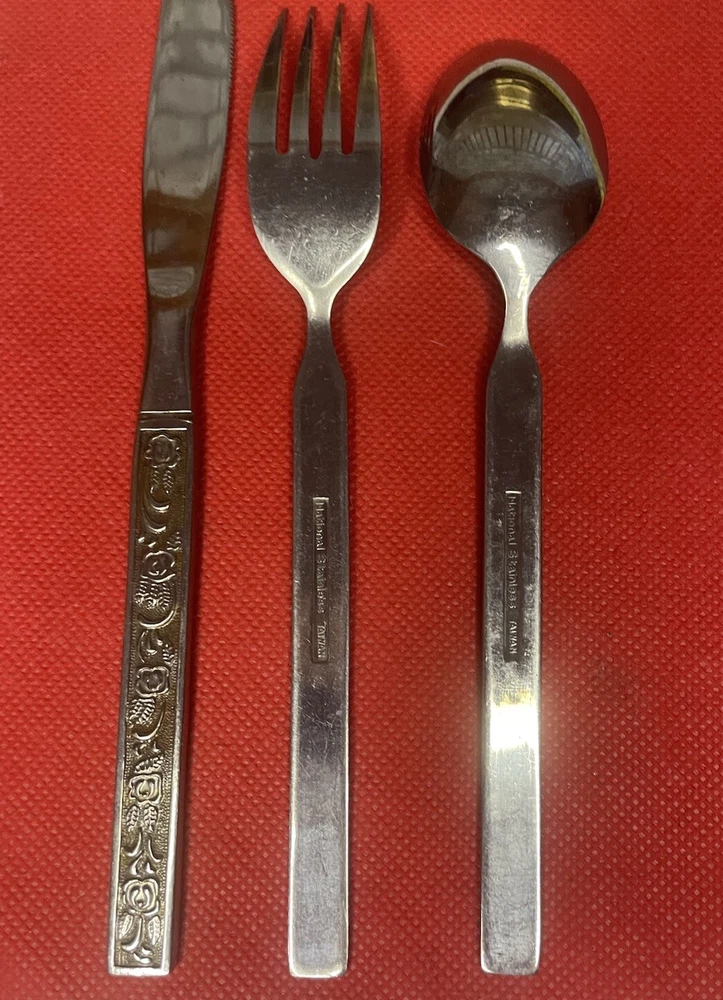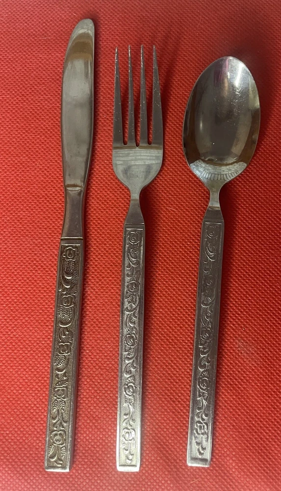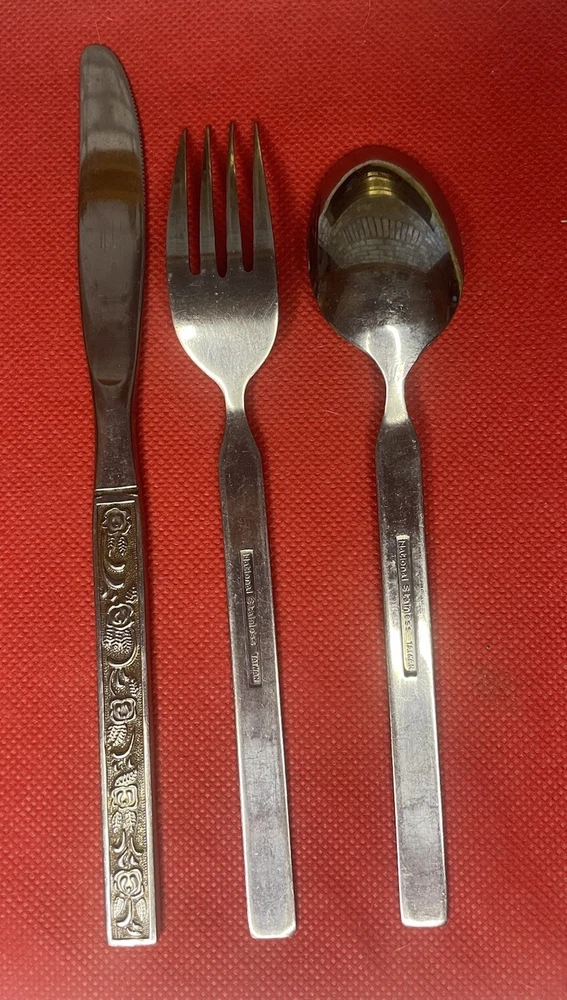 National Flatware ~Costellano~ Set Of Dinner Knife Dinner Fork Tablespoon Floral. All pieces are in very good condition with scratching. Shipped with USPS Ground Advantage for 8.00