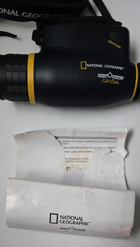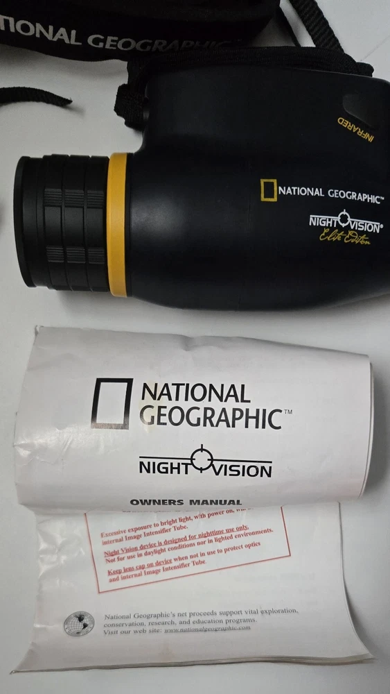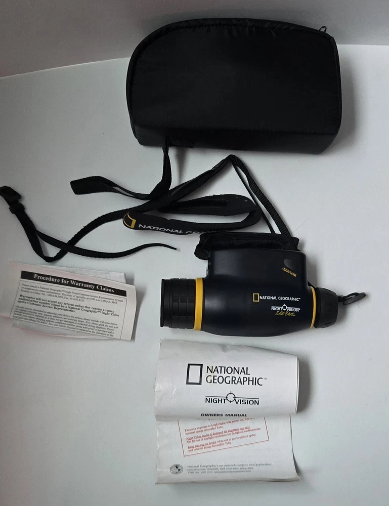 National Geographic Night Vision Elite Edition. Condition is Pre-owned good works as it should shows wear from normal use. Batteries not included. Battery Compartment shows Battery leakage cleaned best i could can be better. Tested works as it should. Manual has rip on back page. Please look at all the pictures carefully for more detail. So please If you have any questions feel free to contact me. Please note that if you are buying from outside the United States your country might charge fees that you are responsible for and Any orders shipped using Forwarding Services and shipped out of the country do so at their own risk, these services can inadequately repack the product resulting in damage. Ebay now handles all sales tax, If you reside in a state that requires it, Ebay will include it during checkout. There is nothing I can do to change this. I will only ship to the address on file in the US and a signature will be required at delivery if the sale is valued at over $250. Store terms, policies & disclaimer: All pre-owned, used, new-old-stock, vintage and electronic items are sold as-described, as-is, as-pictured and within their proper category. Items that cannot be fully tested or that may have full or partial functionality may be sold within the "for parts or not working' category yet may be fully-functional. All new items are sold as new. Buyer pays return shipping on any and all returns (if granted) and no partial refunds will be granted, without exception. I inspect, test where applicable and describe items to the fullest extent of my ability. There are no guarantees implicit or otherwise regarding the purchase, use, disposal, functionality and/or viability of pre-owned, used, vintage and/or electronic items unless otherwise noted. There may be dust and/or typical wear for age on items. Please ask any and all questions before purchase. Combined shipping only if buyer communicates desire before bidding or purchase and the listings end within 24 hours of each other. Please do not request to adjust "lots". Please bid or purchase responsibly and only if funds are immediately available (no 'layaway'). Do not withdraw bids without valid explanation: you will be blocked from any further bidding and purchases. eBay automatically opens an Unpaid Item Reminder Case in two days if unpaid, thus it is the buyer's responsibility to communicate payment delays and issues promptly. A 15% restocking fee will be deducted from the final purchase price of any item returned for a refund contrary to the stated return policy. Please contact me directly first via the "other" option on the "contact seller" page to resolve issues before opening a case or remitting feedback if there is any issue or concern with any item. Not doing so will void any return process, impact the ability for future purchases and affect the resolution of any case opened and/or negative feedback. By bidding upon or buying my items, the buyer agrees to and understands these terms, policies and disclaimer. Please review my positive feedback from all of my satisfied clients. Any reasonable offers will be considered. Thank-you!
