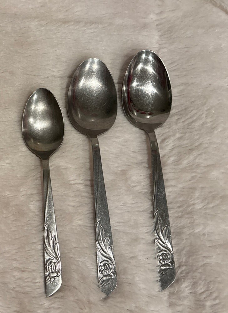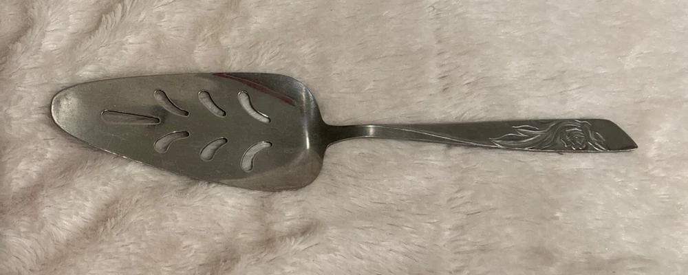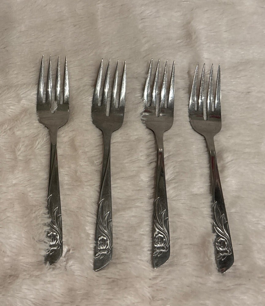 There are 4 salad forks. 1 pie server. 5 knives. 1 teaspoon and 2 tablespoons. Carlyle rose is the pattern from N.S.C.O from Japan stainless steel