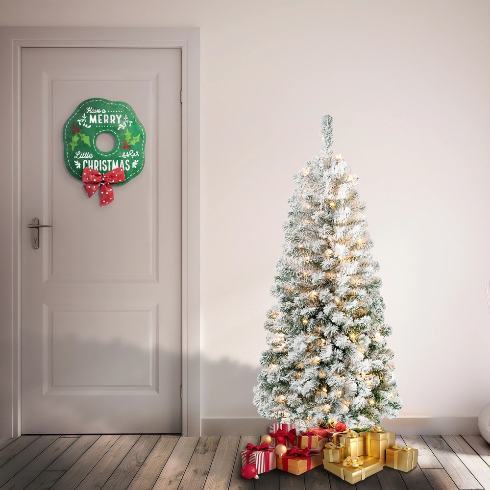 1. This slim and elegant flocked Acacia tree is perfect for small spaces, adding a snowy winter charm to any room. The pre-lit branches are easy to assemble, and the lights stay bright even if a bulb goes out. It looks stunning in corners or tight spots, and the sturdy stand keeps it secure. A beautiful, hassle-free holiday decoration!