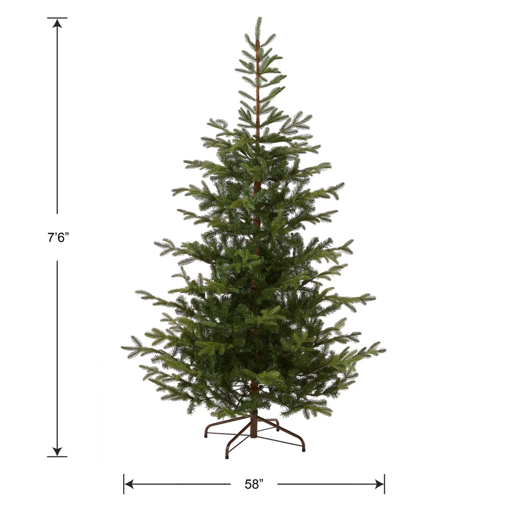 This Norwegian Spruce Artificial Green Christmas Tree is 7.5 feet tall with a 58 inch base diameter. Featuring hundreds of 'Feel Real' individually crafted branch tips to create full bodied branches. Designed to look and feel lifelike, this tree is defined by its close attention to detail, featuring hundreds of individually crafted branch tips that make up the wide, full-bodied branches that create space for your lights and ornaments. This tree features pre-attached, hinged branches that drop down for a simple set-up and fold back in for quick and convenient storage. Set aside 45-60 minutes to properly shape the tree by peeling back the branches and pulling the tips apart. Constructed with sturdy, high quality materials, hypo-allergenic, fire-resistant needles, this tree is built to bring holiday cheer for years to come. Includes a durable metal base. At , we believe that special holiday memories don’t have to be far and few between. This Christmas season, let our decorations transform your home while you focus on creating more of those magical moments.