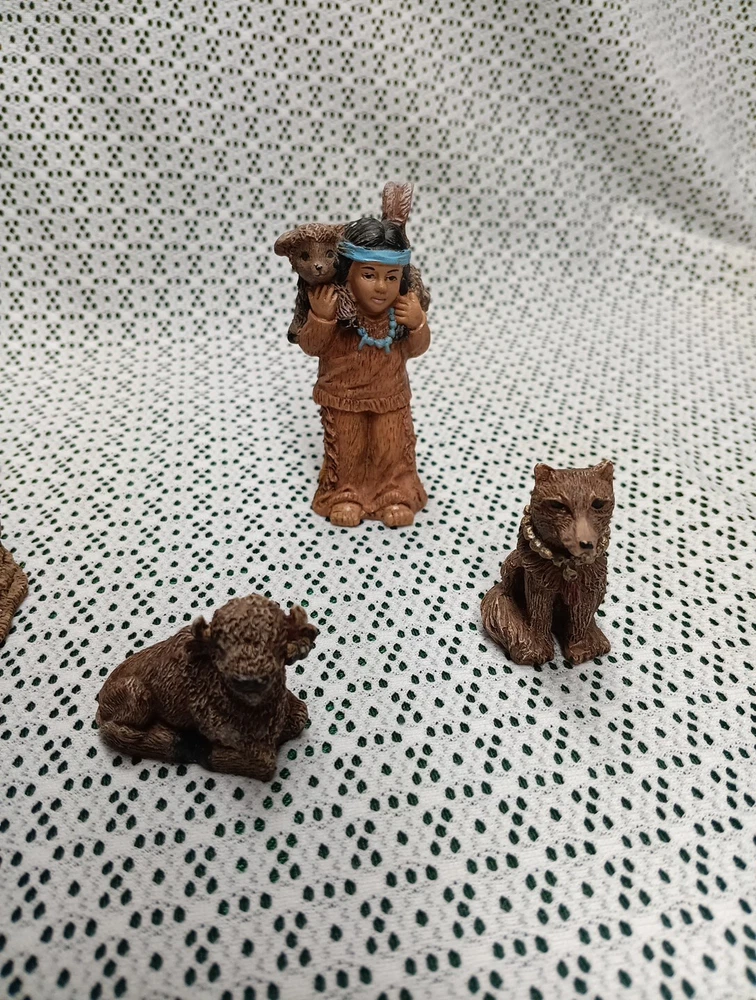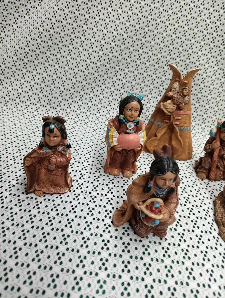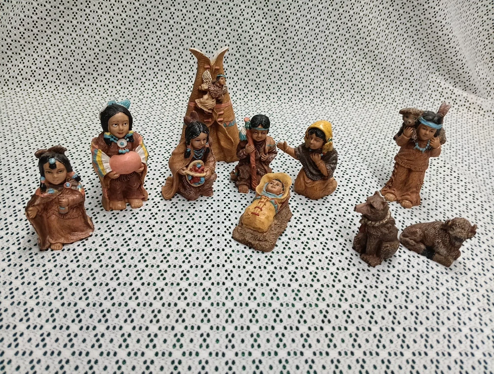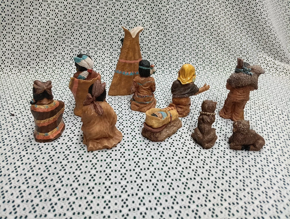 Native American Indian Nativity Set 10 Pieces w/Teepee and Animals. Vary from 2 to 3.5 inches. Touched up chip about the size of a green pea.