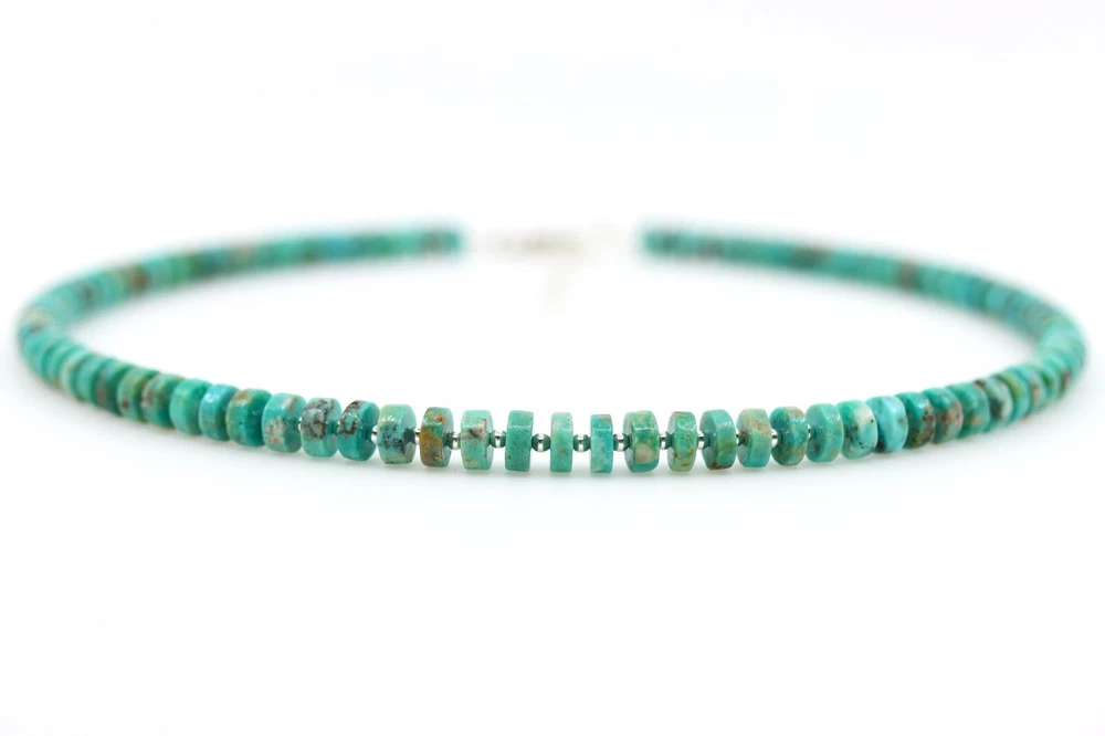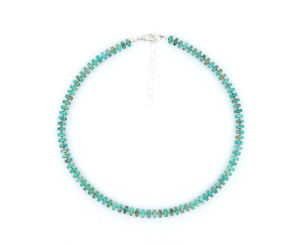 This modern heishi necklace features 6mm genuine Arizona turquoise beads, strung in a symmetrical, repeating pattern. Each bead is meticulously hand-selected for pure color, clean cuts, and uniformity in size, creating a refined yet free-spirited piece. Ideal for layering or wearing solo, this necklace blends modern minimalism with a Southwestern-inspired charm, perfect for both men and women. Inspired by traditional Native American dress, this necklace reflects the timeless beauty and intricate beadwork of Southwestern culture. The striking blue green turquoise beads add a captivating allure, making this piece a standout addition to any jewelry collection. This necklace can be worn alone or paired with your other favorite jewelry for a layered look. Origin & Metaphysical Properties: Mined in Arizona, USA, this turquoise is valued for its pure greenish-blue color and minimal matrix. Known for its protective and calming energy, turquoise is believed to promote inner peace, self-confidence, and harmonious communication. Bead Size: 6mm Color: Blue Green Metal: Sterling Silver Styling: Unisex styling, suitable for any gender; a thoughtful gift Necklace Length: Available in lengths from 14"-28"; please select from the dropdown menu Packaging: Ready for gift-giving Processing Time: Ships within 3 days of payment U.S. Shipping: Shipped via USPS 1st Class Mail, with an estimated delivery time of 2-4 business days (range: 2-9 days). International Shipping: Shipped via USPS 1st Class International Mail, with typical delivery between 10-21 business days. Origin & Metaphysical Properties: Sourced from Arizona, USA, this turquoise is prized for its vibrant greenish-blue color and minimal matrix. Known as a purification stone, it symbolizes serenity, protection, and self-confidence.