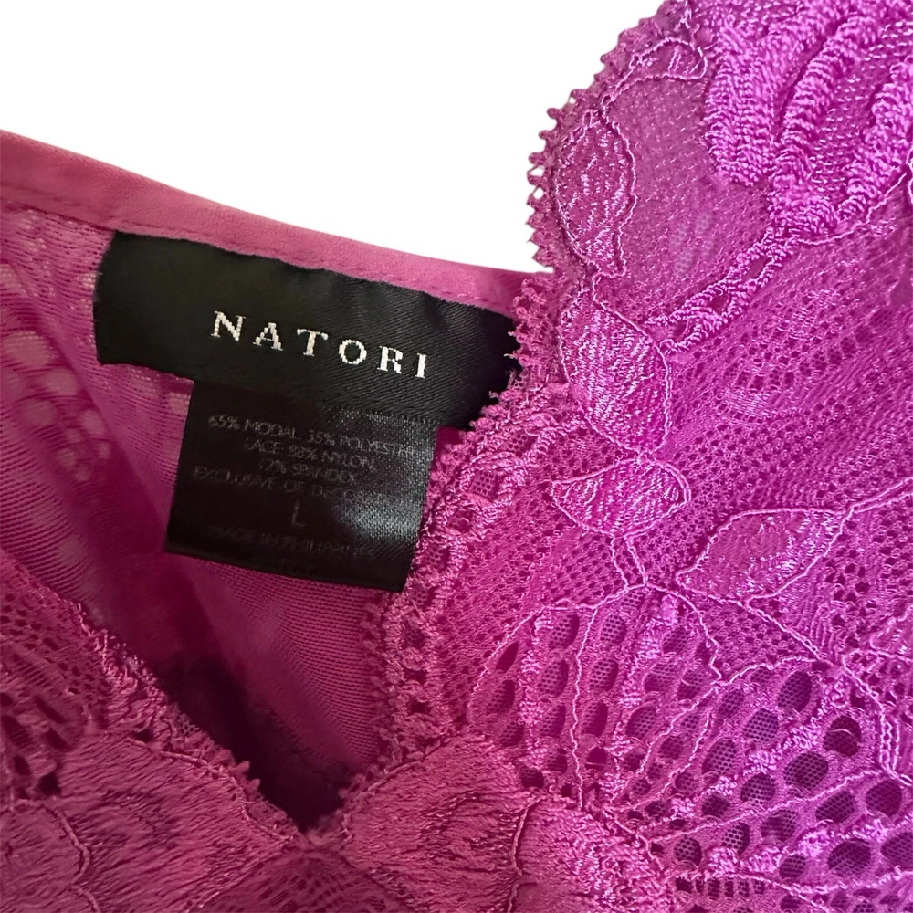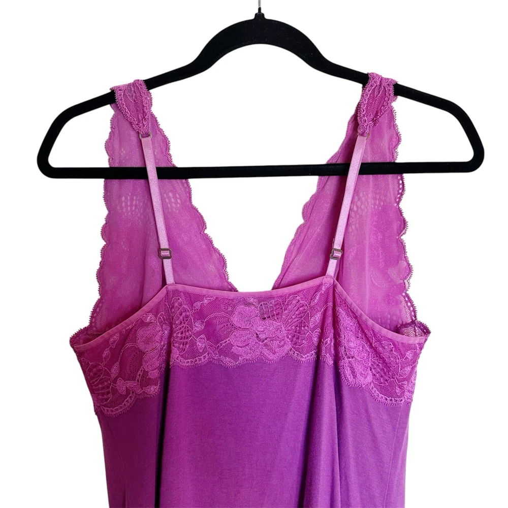 Elevate your nighttime attire with the Natori ZEN Soft Modal Lace Magenta Purple Babydoll Chemise Slip Dress Nightie. Designed with a commitment to comfort and style, this dress features a lightweight modal fabric, adorned with delicate lace that adds a touch of romance to your sleepwear collection. Its adjustable straps ensure a perfect fit for a size small, while the V-neckline complements the overall elegance. The solid purple hue exudes a calming, yet feminine vibe, making it an ideal choice for a relaxing night's sleep or a cozy morning brunch. The dress's babydoll style is a timeless piece that pairs effortlessly with your favorite robes or slippers. Whether it's for intimate evenings or lazy weekend mornings, this Natori dress promises both comfort and style.