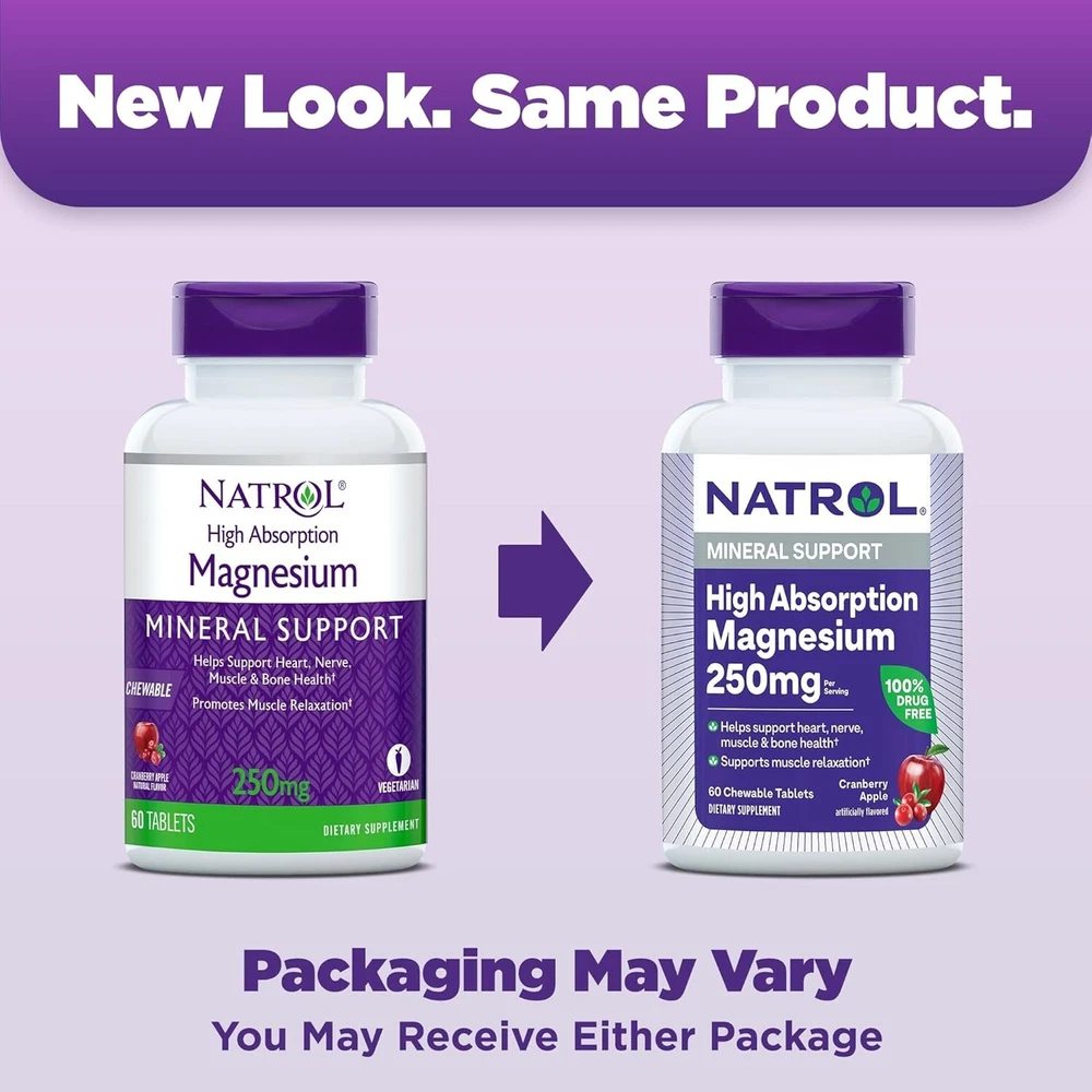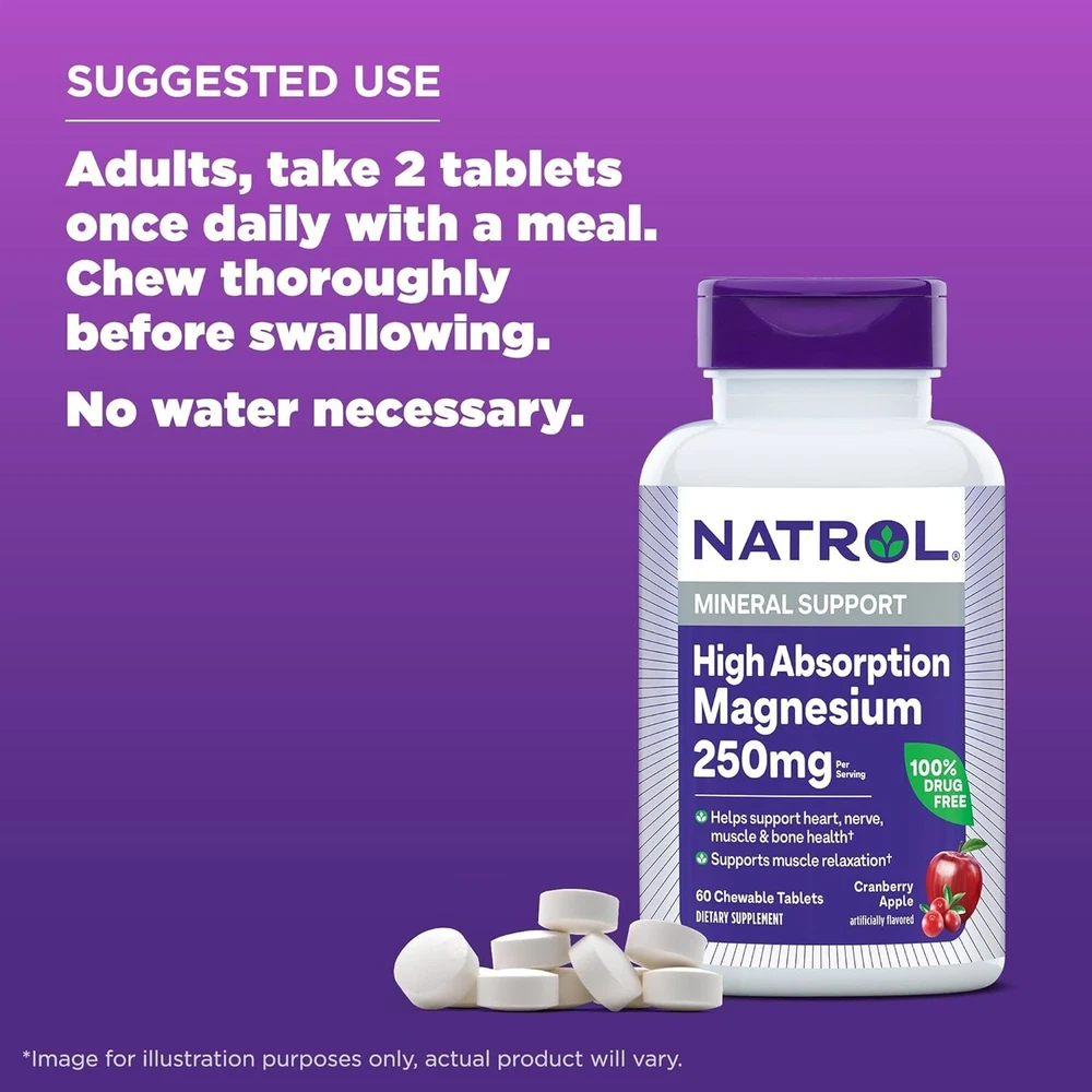 Natrol High Absorption Magnesium 250 mg, Dietary Supplement to Support Heart, Nerve, Muscle and Bone Health, 60 Cranberry Apple-Flavored Chewable Tablets, 30 Day Supply Chewable Magnesium Supplement: One (1) 60 count bottle of Natrol High Absorption Magnesium Cranberry Apple Artificially Flavored Chewable Tablets for a 30-day supply High Absorption Magnesium: Magnesium supplement chewable tablets that provide magnesium 250 mg in a highly absorbable form to help support heart, nerve, muscle and bone health (1) Easy-to-Take Tablets: Delicious cranberry apple artificially flavored chewable magnesium tablets are easy to take anytime, anywhereno water needed when taking this dietary supplement How to Take: Adults, take two tablets once daily with a meal; chew thoroughly before swallowing, no water necessary Disclaimer: (1) These statements have not been evaluated by the Food and Drug Administration; this product is not intended to diagnose, treat, cure or prevent any disease From the manufacturer Natrol Mood & Stress Supplements - the #1 5-HTP Brand in America^ STRESS LESS. LIVE MORE. Natrol 5-HTP, the #1 5-HTP brand in America,^ is a 100% drug-free way to support a balanced mood by supporting the body’s production of serotonin, the chemical messenger that helps regulate mood.† Go ahead and balance your mood with Natrol 5-HTP. ^Nielsen, xAOC, 52 weeks ending 03/30/24, 5-HTP