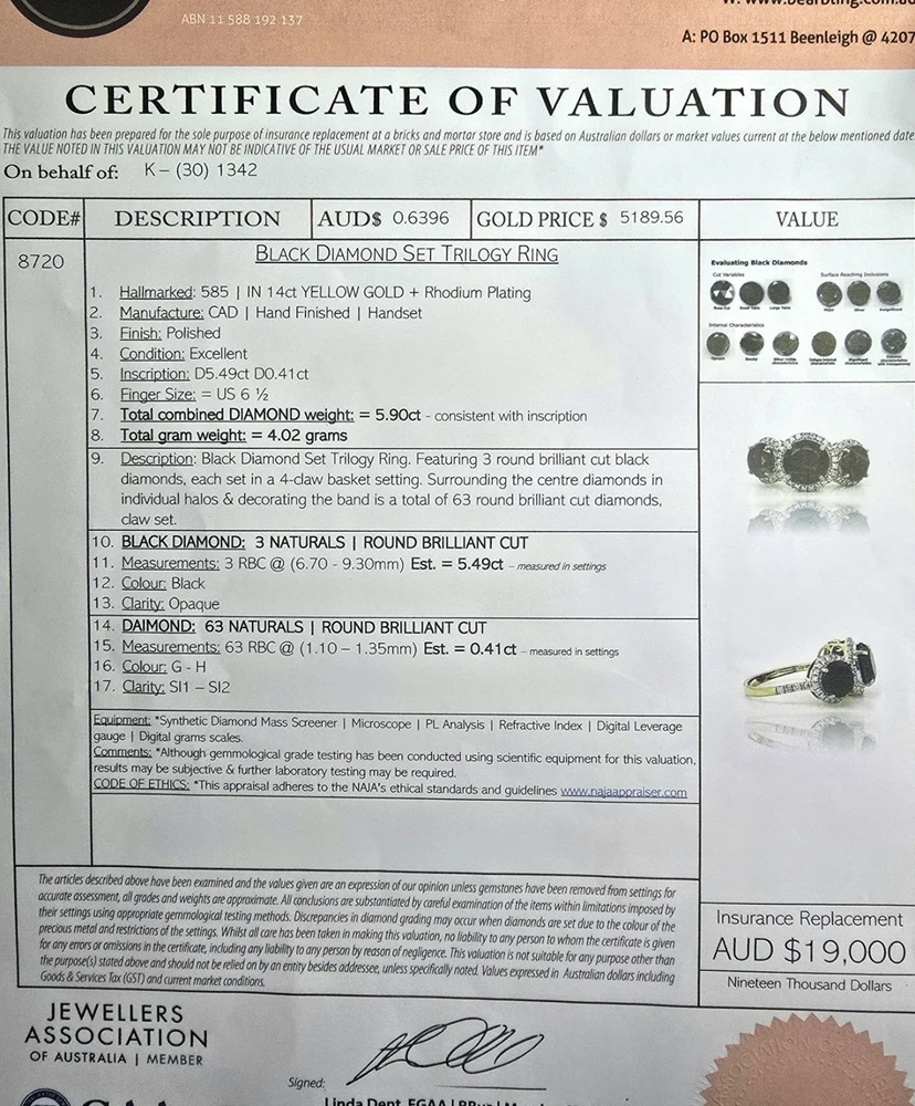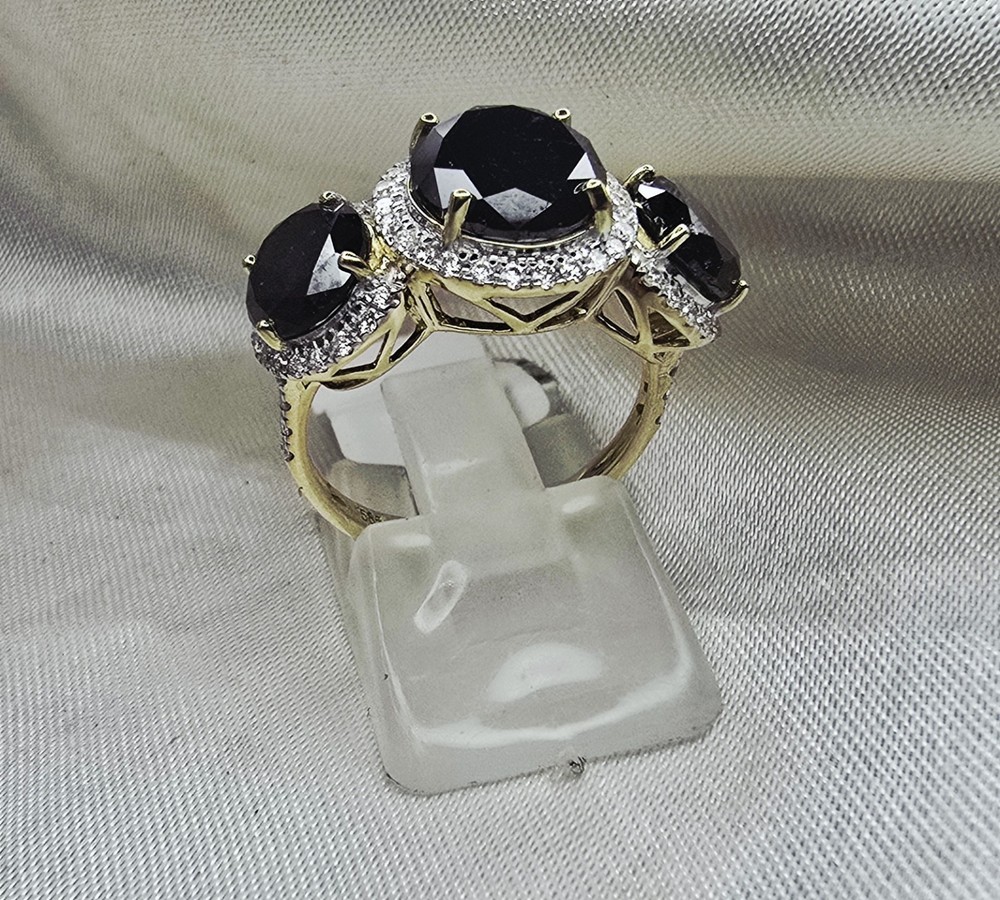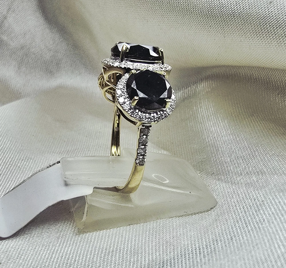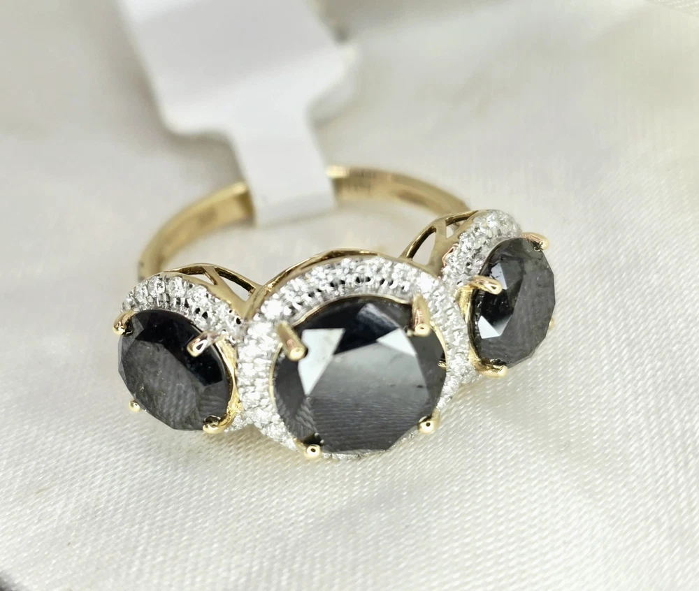 Brand New THE CHARMED COLLECTION APRIL BIRTHSTONE 60 & 75th ANNIVERSARY MOH SCALE: 10/10 DESCRIPTION Crafted in 14ct Yellow Gold Featuring 3x Natural Black Diamonds in a Round Brilliant Cut in a Trilogy Design, with Natural White Diamond Halos. Weight: 4.02 grams Ring Size: L (6 US) 3x Natural Black Diamond Centre in a Round Brilliant Cut Weighting a Total of 5.49ct White Round Brilliant Cut Diamonds Weighting a Total of .41cts Colour G - H Clarity SI 1 - 2 ACCREDITATION Australian Industry Standard JAA & GAA Member Independent Valuation Provided Retail Replacement Value $7,890.00 All Brand New Pieces Come With A 12 Month Manufacturing Warranty All Brand New Pieces Come With A 12 Month Manufacturing Warranty BLACK DIAMOND FACT Black diamonds are not mined from deep below the earth's surface, where other diamonds are typically found. Black diamonds are mined from the beds of streams, and scientists have dated them as being formed up to 3.8 billion years ago. These facts have led to multiple theories being formed about where they come from. DIAMOND FACT 1477 Archduke Maximilian of Austria proposed to Mary of Burgundy with the first recorded diamond engagement ring.