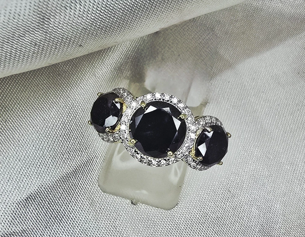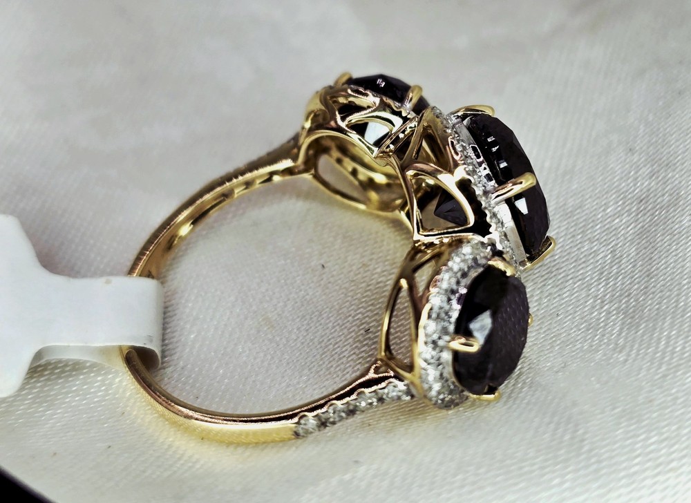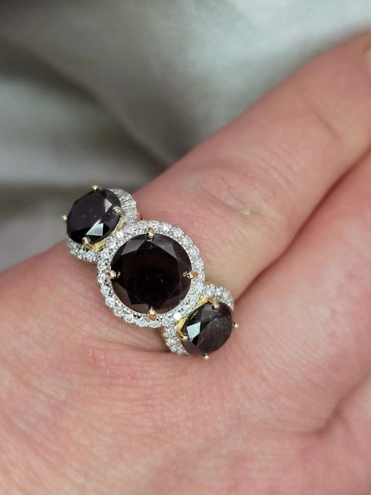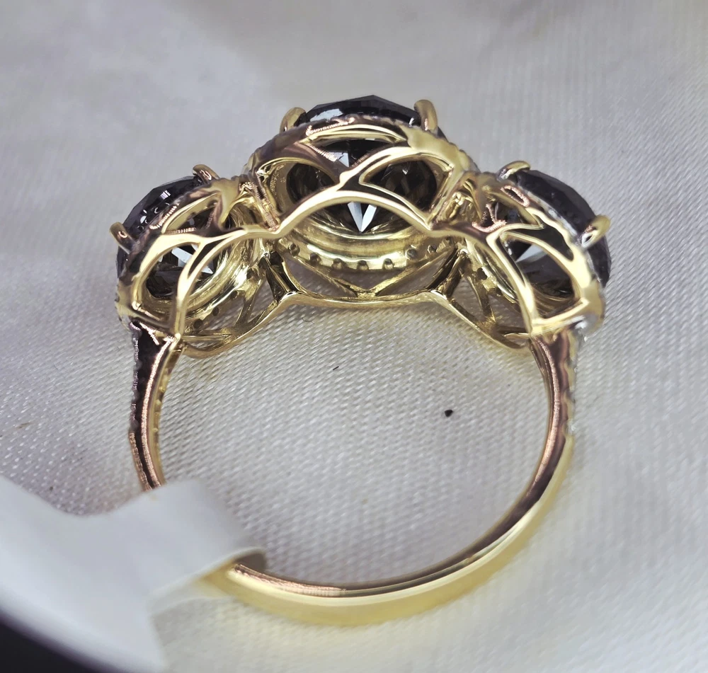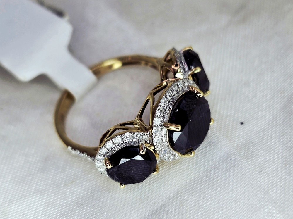 Brand New THE CHARMED COLLECTION APRIL BIRTHSTONE 60 & 75th ANNIVERSARY MOH SCALE: 10/10 DESCRIPTION Crafted in 14ct Yellow Gold Featuring 3x Natural Black Diamonds in a Round Brilliant Cut in a Trilogy Design, with Natural White Diamond Halos. Weight: 4.02 grams Ring Size: L (6 US) 3x Natural Black Diamond Centre in a Round Brilliant Cut Weighting a Total of 5.49ct White Round Brilliant Cut Diamonds Weighting a Total of .41cts Colour G - H Clarity SI 1 - 2 ACCREDITATION Australian Industry Standard JAA & GAA Member Independent Valuation Provided Retail Replacement Value $7,890.00 All Brand New Pieces Come With A 12 Month Manufacturing Warranty All Brand New Pieces Come With A 12 Month Manufacturing Warranty BLACK DIAMOND FACT Black diamonds are not mined from deep below the earth's surface, where other diamonds are typically found. Black diamonds are mined from the beds of streams, and scientists have dated them as being formed up to 3.8 billion years ago. These facts have led to multiple theories being formed about where they come from. DIAMOND FACT 1477 Archduke Maximilian of Austria proposed to Mary of Burgundy with the first recorded diamond engagement ring.