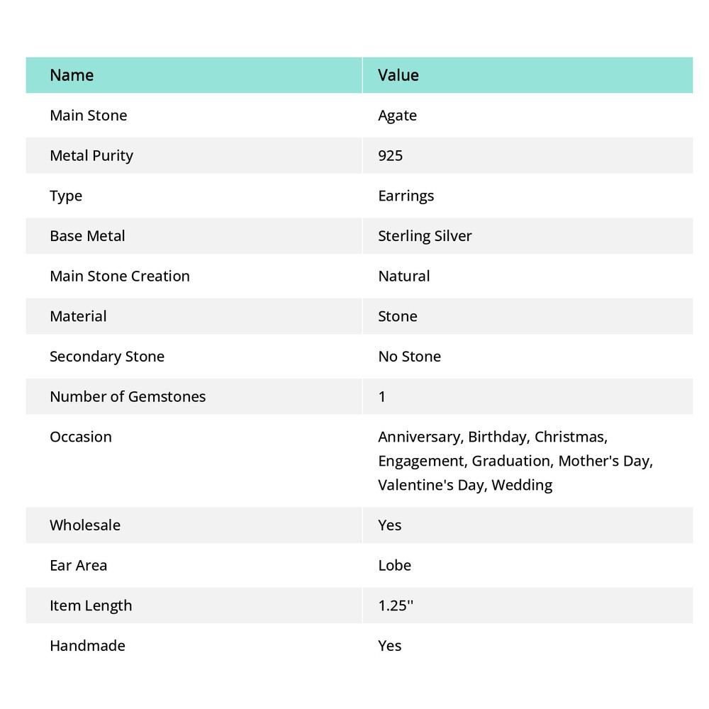 Country/Region of Manufacture: India Country of Origin: India Shape: Same As Picture Total Carat Weight: 50 Carat Above Setting Style: Channel-Set Vintage: No Wholesale: Yes Brand: Unbranded Theme: Art, Beach, Beauty, Family & Friends, Love, Luck Style: Drop & Dangle Item Length: 1.25'' Features: Engraved Secondary Stone: No Stone Type: Earrings Number of Diamonds: 0 Main Stone Treatment: Not Enhanced Cut Grade: Fair Certification: Yes Metal Purity: 925 gtin13: does not apply Era: Undated Number of Gemstones: 1 Main Stone Creation: Natural Diamond Clarity Grade: Not Applicable Fastening: Fish Hook Base Metal: Sterling Silver Closure: French Wire Occasion: Anniversary, Birthday, Christmas, Engagement, Graduation, Mother's Day, Valentine's Day, Wedding Material: Stone Diamond Color Grade: Not Applicable Main Stone: Agate Metal: Sterling Silver Gemstone Clarity Grade: Eye Clean Handmade: Yes Main Stone Color: Multicolor Main Stone Shape: Same As Picture Ear Area: Lobe ProductName: Earrings Color: Multicolor Signed: Yes UPC: does not apply Colored Diamond Intensity: Not Applicable Weight: 4.9 gm