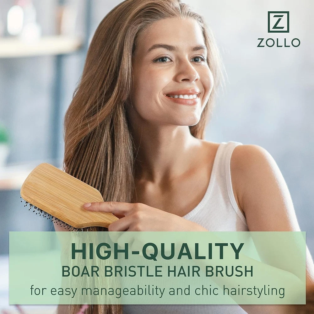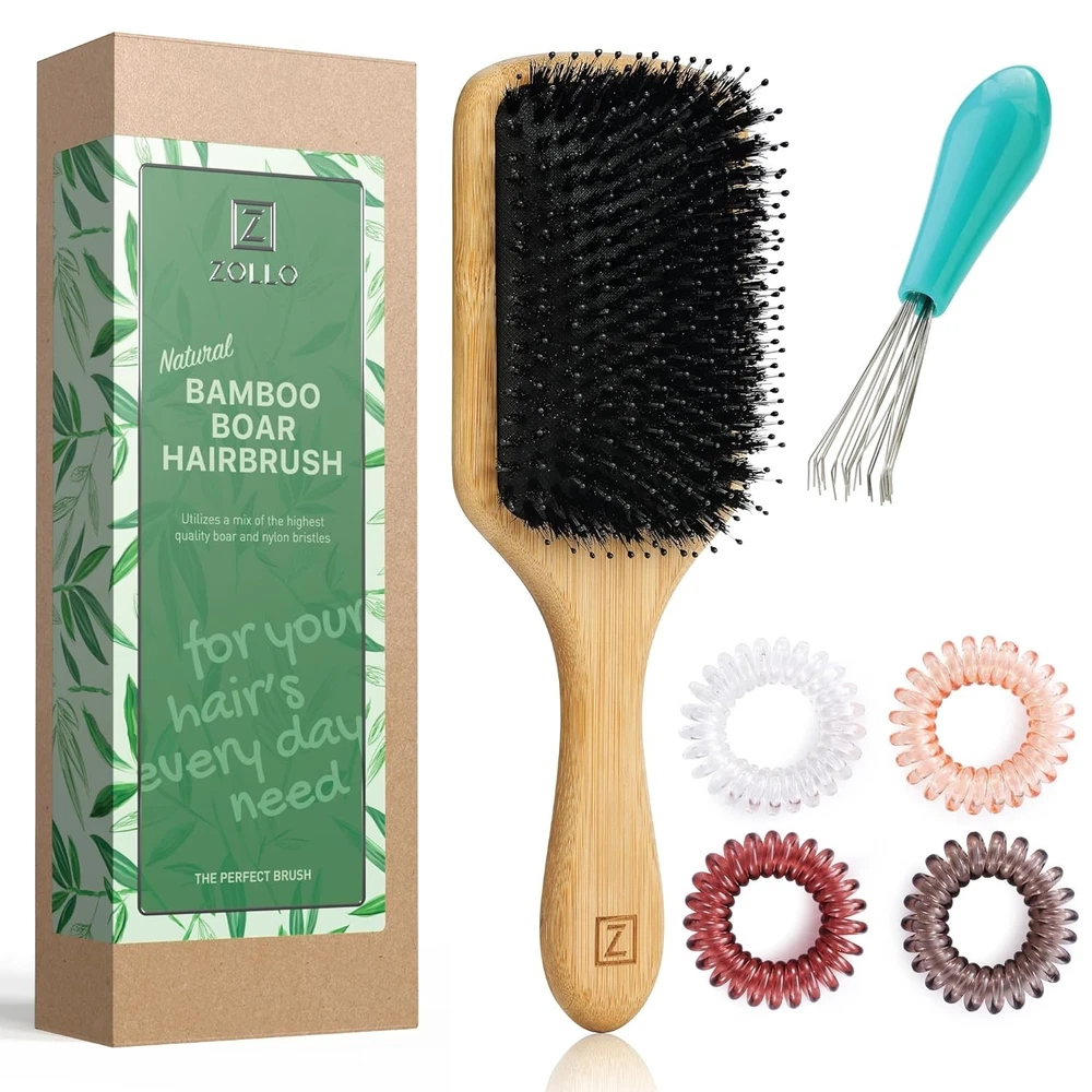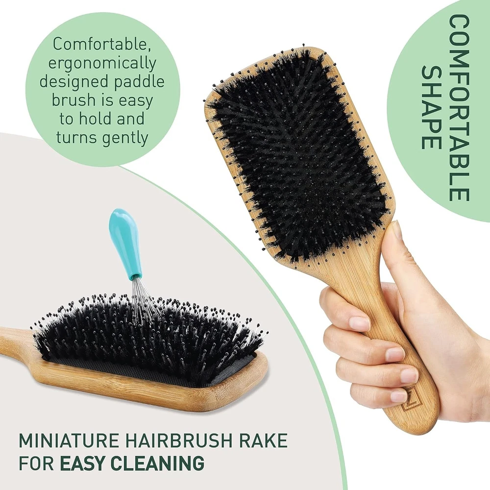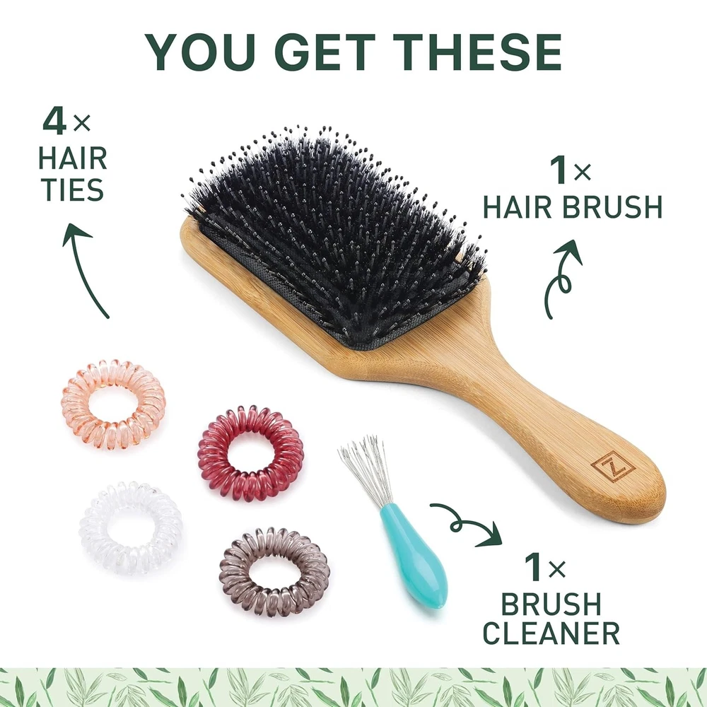 Authentic Black Boar Hair Sourced Responsibly: The seasonal harvesting process yields lush, pure boar hairs and doesn’t harm the animals. Rather than the low-end brown hairs, we use the finest black boar hairs because they’re the best to rehydrate and restore your hair’s natural moisture balance. A Perfect Balance of Boar and Nylon Bristles: Nylon pins with rounded tips softly detangles while the fine boar bristles spread the natural oils from roots to tips to smooth and moisturize. This smart design leaves hair nourished and stylish. The Best Hair Brush as a Styling Tool for Wet and Dry Hair: Designed for shaping and styling, detangling and smoothing, this natural hair brush is a wonderful defense against limp and frizzy hair. Use it after showers, exercise and sleep as a detangler and watch as it tames and polishes your locks. Round Paddle Hair Brush with an Eco Friendly Bamboo Handle: Everything about this hairbrush for men, women and kids ensures a commitment to respect the planet and all of its inhabitants with cruelty free treatment. Bamboo is a fast-growing renewable resource, so it’s a perfect complement to boar’s hair. Includes Functional Hair Accessories: Easily clean the brush with the mini-rake that efficiently and quickly captures loose hair and pulls it from the bristle. We’ve also added 4 spiral ponytail hair ties in natural hair colors for your convenience.