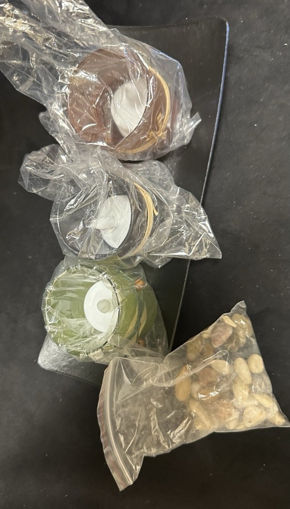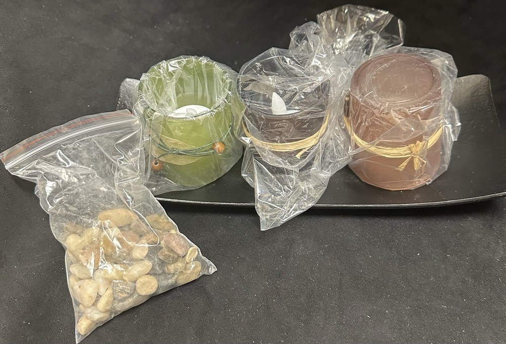 The Natural Candlescape Set is a decorative and calming addition to any indoor space, particularly the dining room. This set includes a tray, three votive cups, three LED tea lights, and rock. The multicolored glass items exude a serenity pattern, offering a natural finish to enhance the ambiance of your home. This free-standing set is easy to clean with a damp cloth and adds a personal touch with its decorative features. Perfect for votive candles and tea lights, this set allows you to create a relaxing atmosphere in your space.