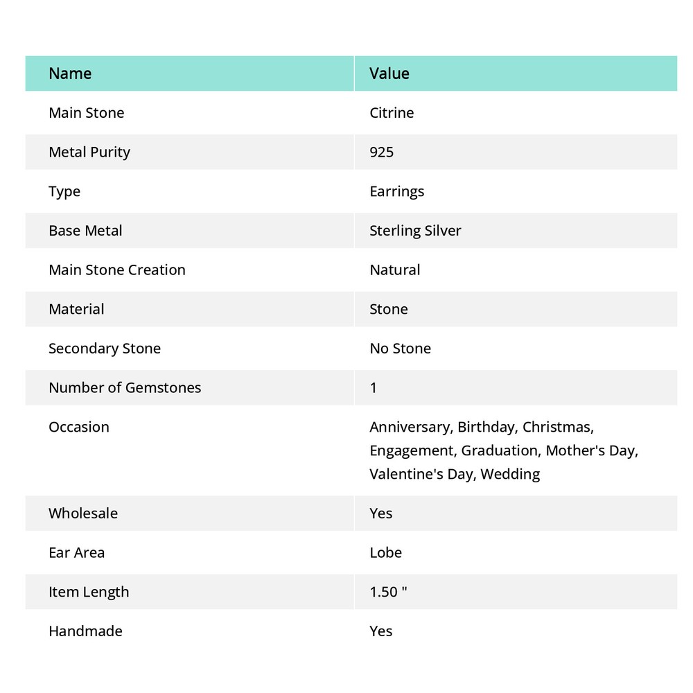 Stone-Size: 6X6mm Diamond Clarity Grade: Not Applicable Material: Stone Metal Purity: 925 Main Stone Creation: Natural Cut Grade: Fair Signed: Yes Fastening: Fish Hook Handmade: Yes Color: Yellow Number of Diamonds: 0 Era: Undated Metal: Sterling Silver Number of Gemstones: 1 Colored Diamond Intensity: Not Applicable Total Carat Weight: 50 Carat Above Vintage: No Main Stone Treatment: Not Enhanced Base Metal: Sterling Silver Country of Origin: India Style: Drop & Dangle Main Stone Color: Yellow gtin13: Does Not apply Diamond Color Grade: Not Applicable Weight: 2.6 gm Setting Style: Channel-Set Country/Region of Manufacture: India Item Length: 1.50 " Main Stone Size: 6X6mm Secondary Stone: No Stone Wholesale: Yes Main Stone Shape: Same As Picture ProductName: Earrings Closure: French Wire Features: Engraved Type: Earrings Brand: Unbranded UPC: Does Not apply Shape: Same As Picture Occasion: Anniversary, Birthday, Christmas, Engagement, Graduation, Mother's Day, Valentine's Day, Wedding Ear Area: Lobe Theme: Art, Beach, Beauty, Family & Friends, Love, Luck Gemstone Clarity Grade: Eye Clean Certification: Yes Main Stone: Citrine