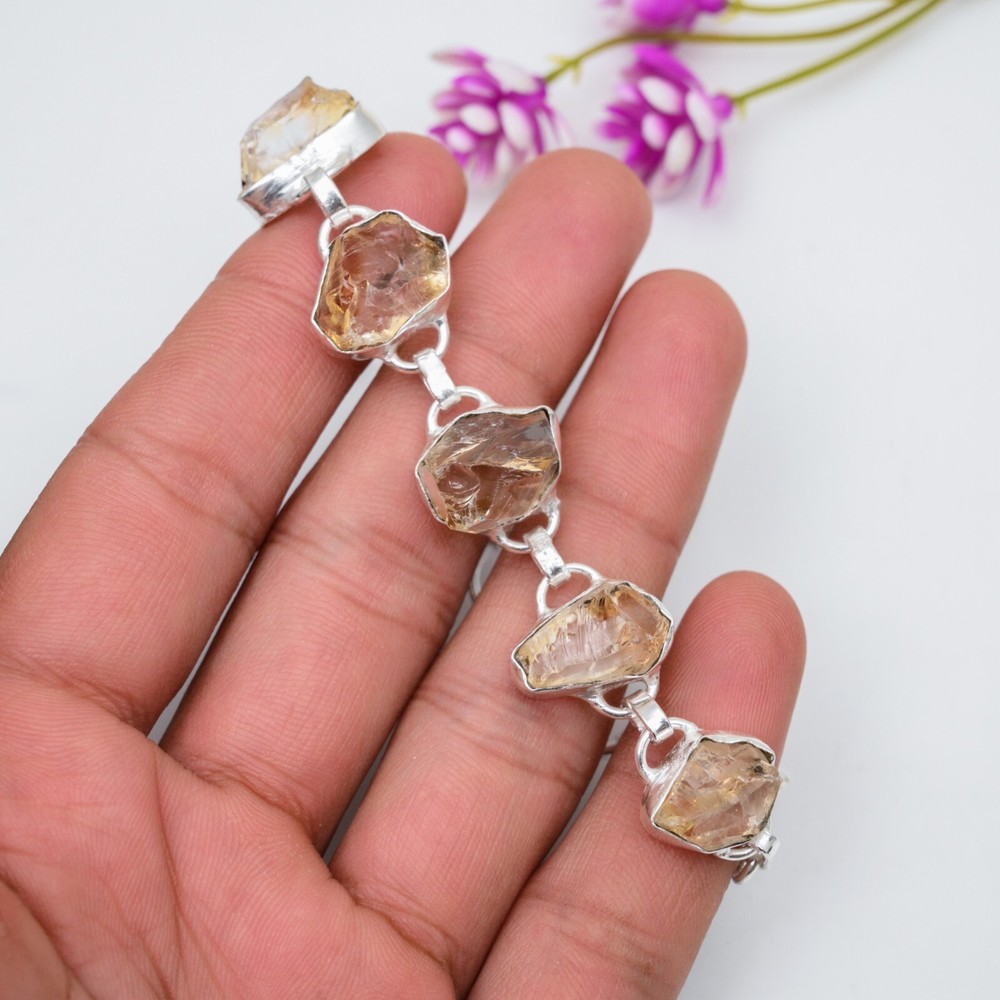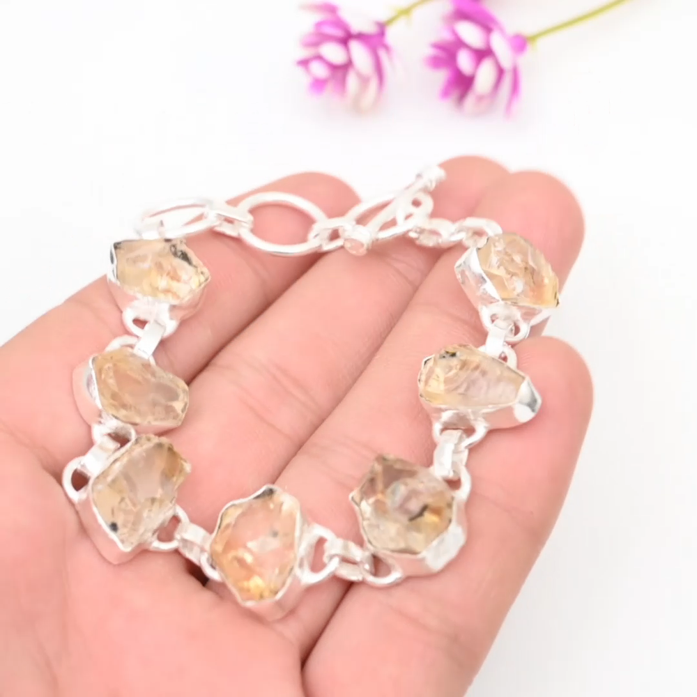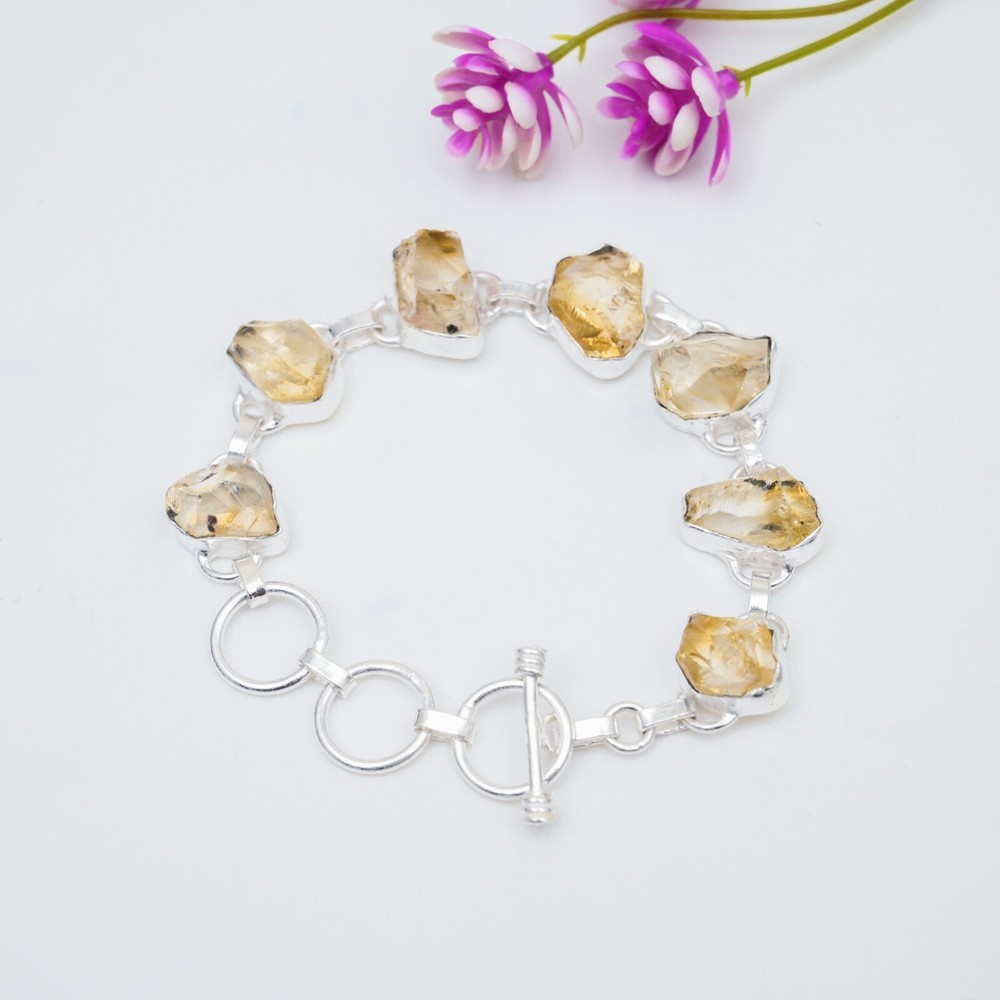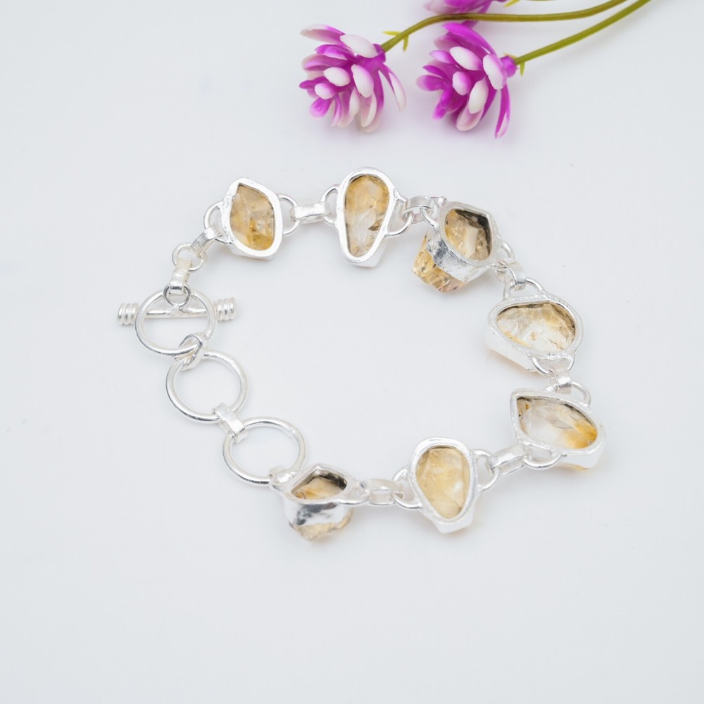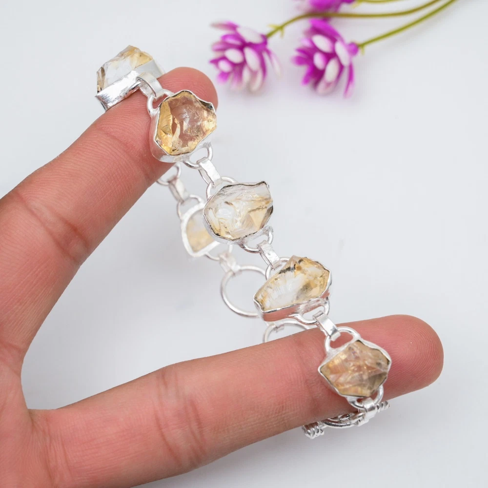 HomeNatural Citrine Raw Gemstone Handmade 925 Sterling Silver Chain Bracelet