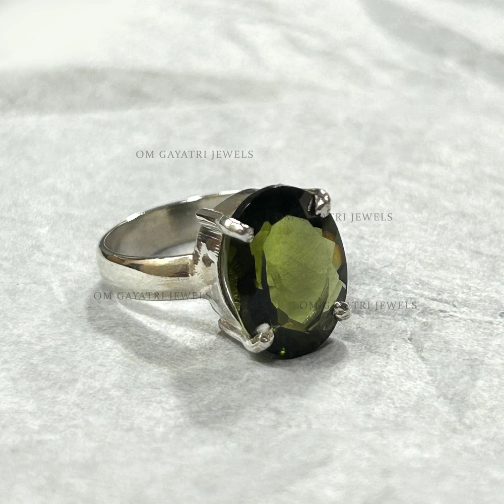 Add a touch of vintage charm to your collection with this beautiful handmade Moldavite ring. The oval-shaped gemstone is set in 925 sterling silver and features a stunning green color that will surely catch anyone's eye. The ring is customizable, making it perfect for engagements, weddings, anniversaries, birthdays, and even Christmas and Valentine's Day gifts. The ring has a bezel setting style and is stackable, making it a great addition to any jewelry collection. The gemstone is natural and has an excellent cut grade, with a clarity grade of eye clean. It has a band width of 2mm and a main stone length of 10mm, with a depth of 2.5mm. This ring is perfect for those who love nature and love themes. Natural Cut Moldavite Ring 925 Sterling Silver Oval Cut Handmade Ring - All Size Gemstone:- Moldavite Stone Size:- 8x10mm Stone Shape:- Oval Stone Category:- Faceted Metal:- 925 Sterling Silver