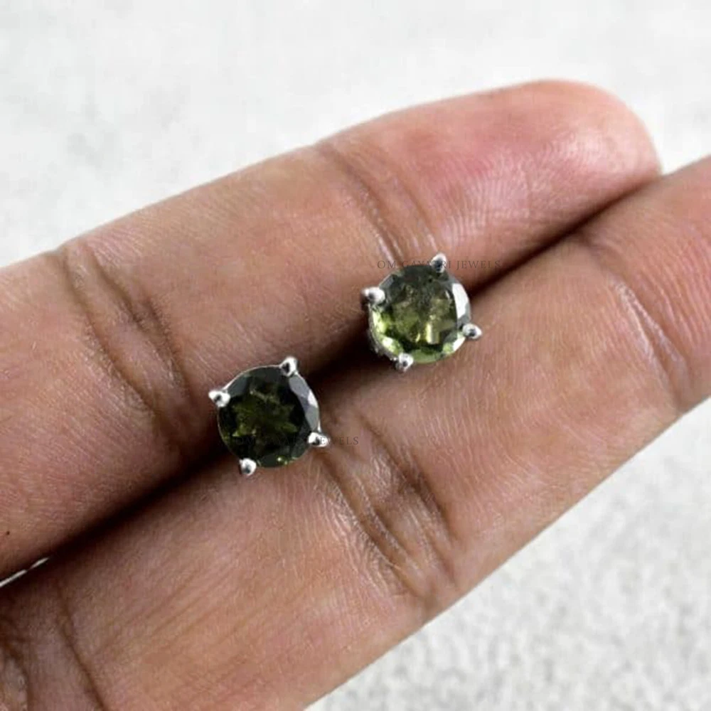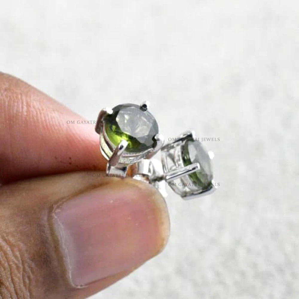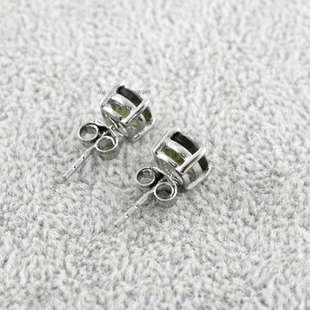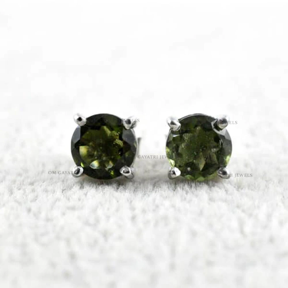 Add a touch of nature to your outfit with these beautiful handmade stud earrings. Crafted from 925 sterling silver, these earrings feature two eye-clean round moldavite gemstones, each measuring 7mm in width and 2.5mm in depth. The prong setting style enhances the natural beauty of the stones, while the butterfly closure ensures a secure and comfortable fit. These earrings are perfect for any occasion, whether it be a wedding, anniversary, birthday, or just a special gift for someone special. Their vintage and art deco era design makes them a unique addition to any jewelry collection. With stackable features and a seller warranty, these earrings are a must-have for anyone who loves nature-inspired jewelry. Natural Czech Moldavite Stud Earrings 925 Streling Silver Handmade Jewelry - 7MM Gemstone: Moldavite Stone Shape: Round Stone Size: 7mm Stone Category: Faceted Metal: 925 Sterling Silver